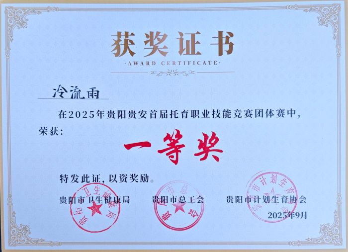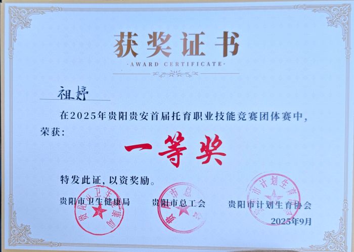 近日,观山湖区熙和萌芽家托育中心在贵阳贵安首届托育职业技能竞赛中,凭借出色的专业素养和过硬的实操技能荣获团体赛一等奖。