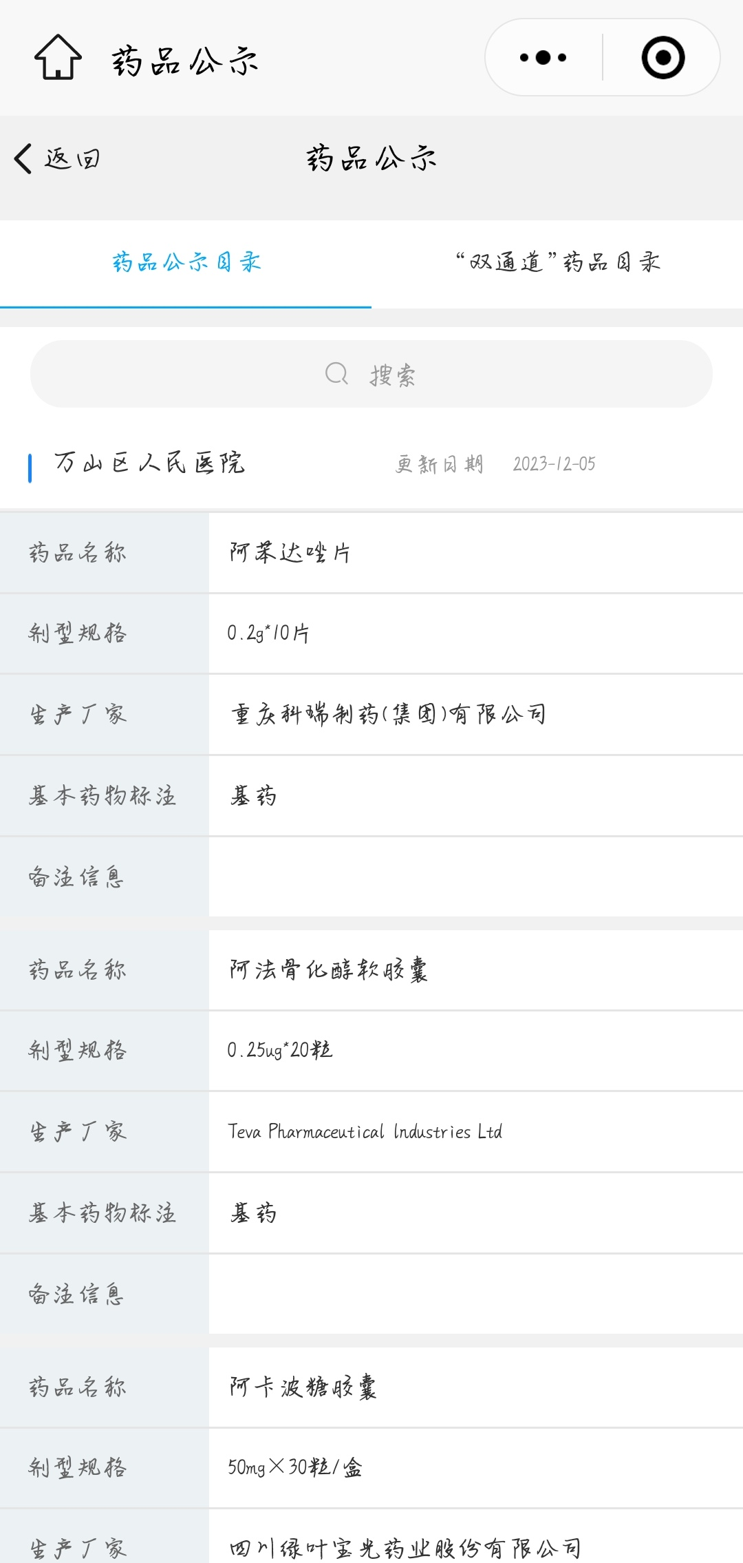 为减轻群众就医购药跑路负担,实现数据多跑路、群众少跑路,铜仁市在健康铜仁微信公众号开通药品信息查询小程序,老百姓可通过手机微信健康铜仁全民健康点击药品公示,查询全市各家医疗机构在售药品品种、剂型、规格、生产厂家以及是否基本药品等信息,目前,全市33家二级及以上公立医疗机构、178家基层医疗机构,公示药品品种数达1190种。