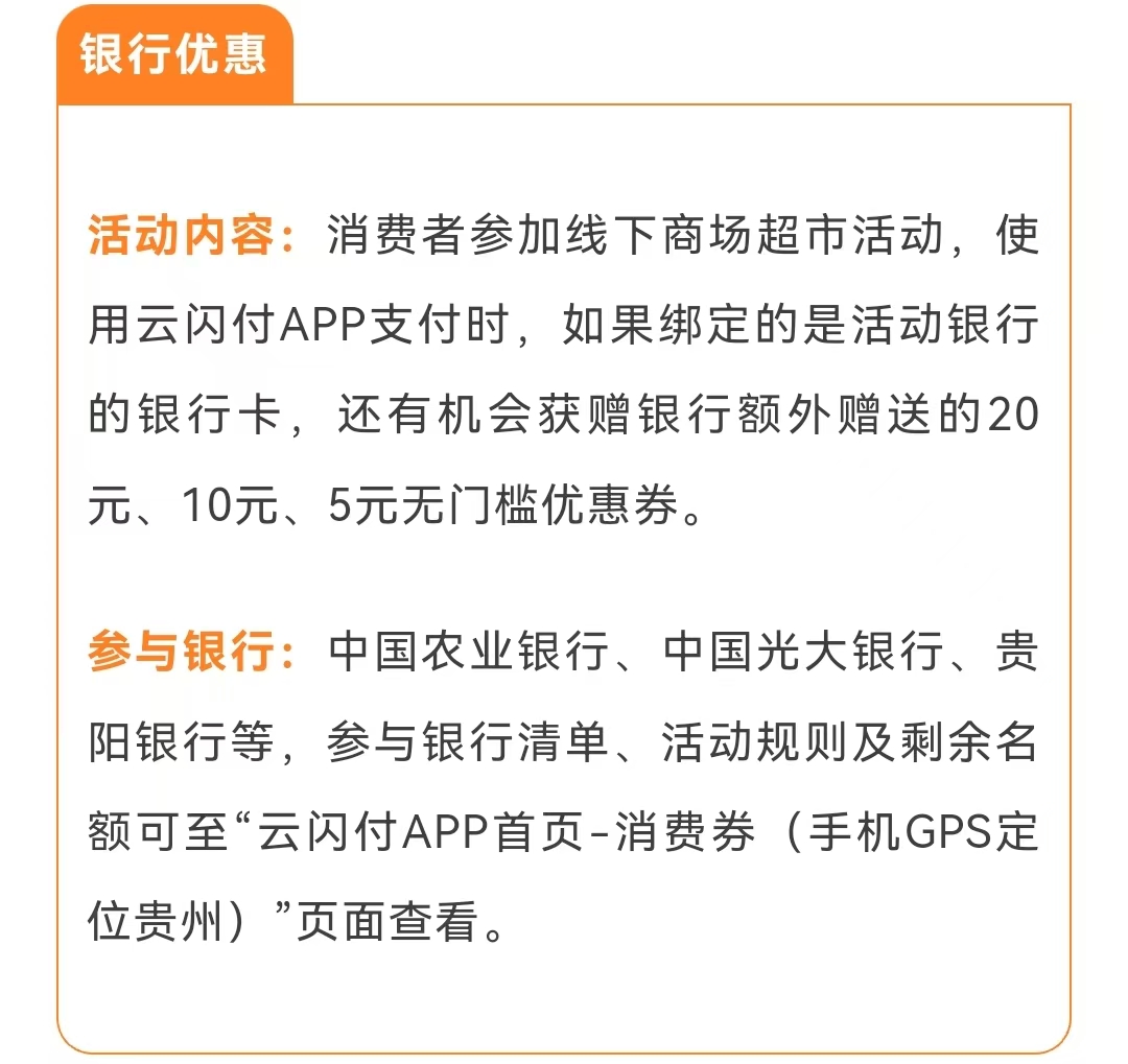 为了方便大家参与,本次活动无需领券。消费者到参与活动的商户消费时,使用云闪付APP或活动银行APP支付即可享受折扣立减优惠。
