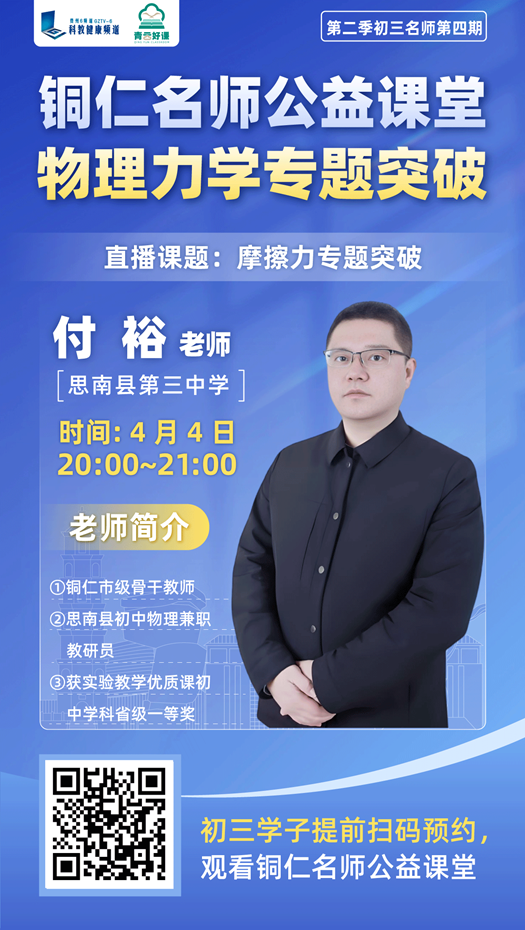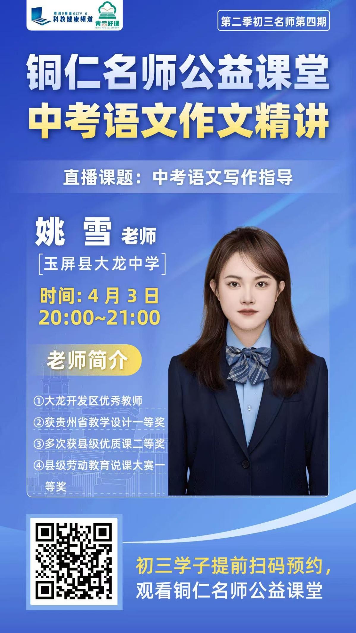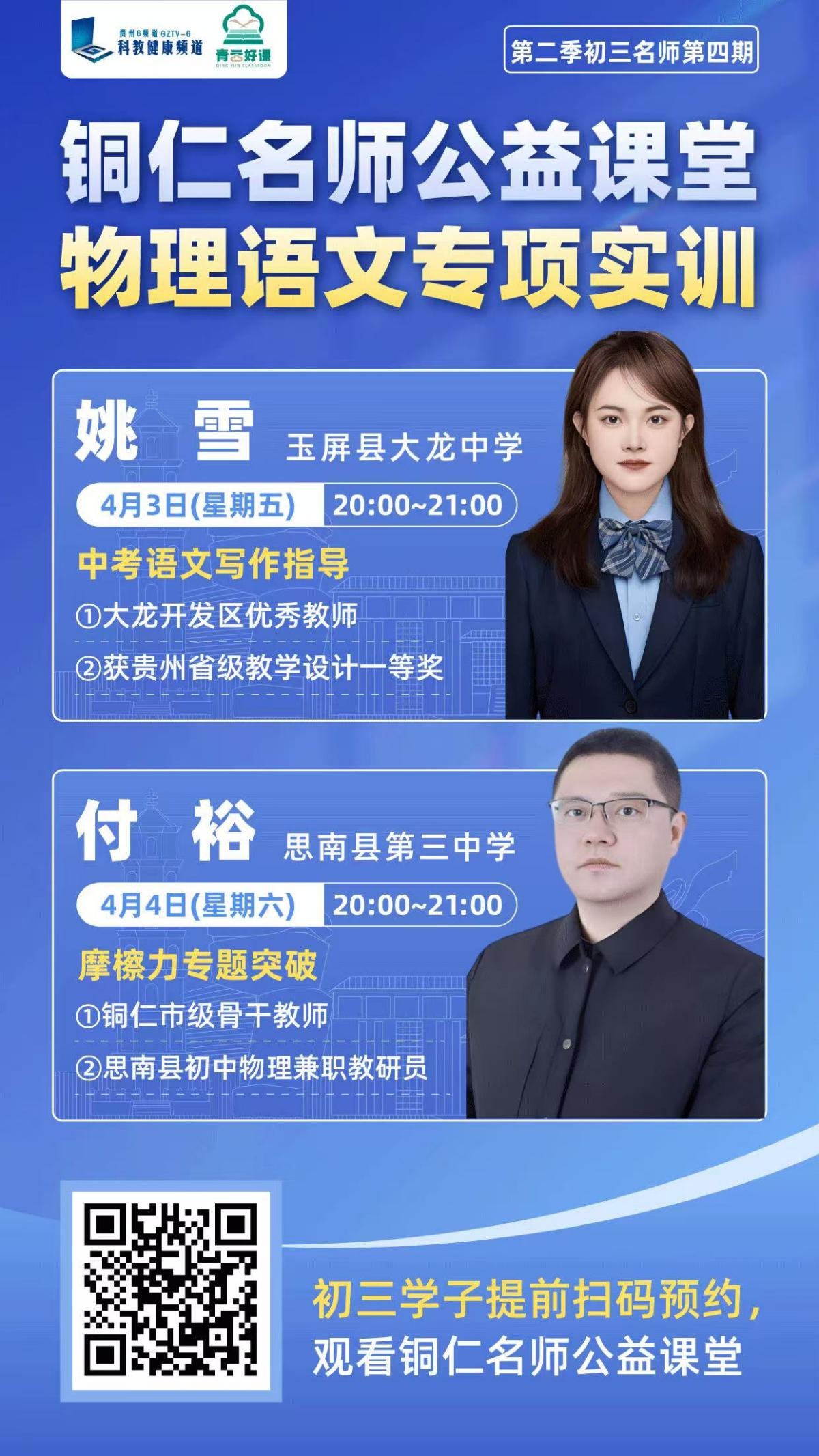 青云好课・铜仁名师公益直播课堂第四期直播定于4月3日(周五)20:00-21:00,玉屏县大龙中学姚雪老师与思南县第三中学付裕老师将作为嘉宾亮相直播间!两位优秀教师深耕初中教学一线多年,对中考命题规律、学生易错点及提分策略有着深刻研究,此次他们将以“中考科目核心考点”为主题,结合历年真题案例,拆解高频考点、梳理答题逻辑,帮孩子把“模糊努力”转化为“精准得分”。