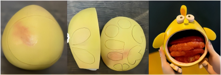 2.在剥下来的柚子皮上画出小鸡五官和四肢,用剪刀沿着画的线剪下;