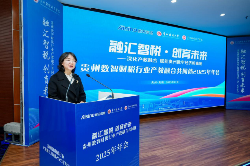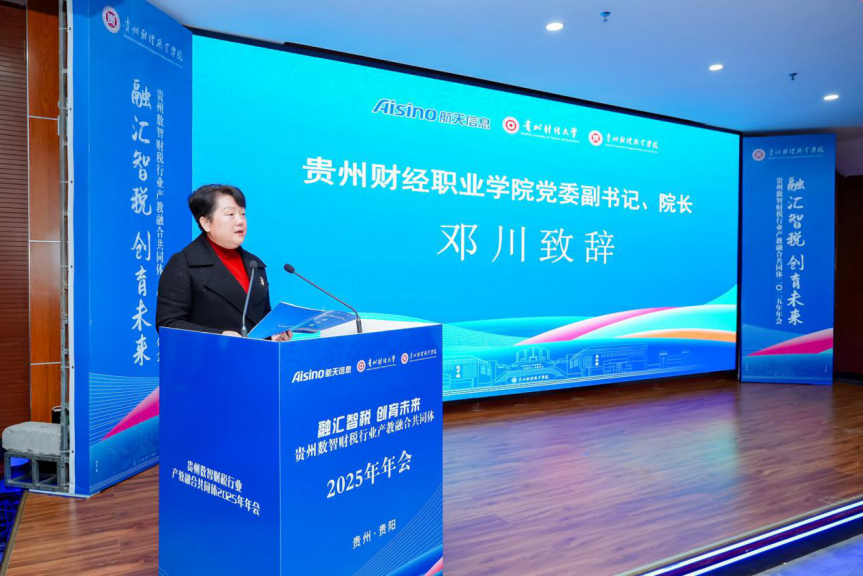 贵州财经职业学院党委副书记、院长邓川在会上致辞,向莅临盛会的领导、嘉宾及各界同仁表示欢迎与感谢。她强调,产教融合是深刻的育人变革,高职院校与企业需打破壁垒,协同破解项目转课题、技术进课堂、标准接需求等核心命题。为此,她提出三点倡议:一是深耕“融”的维度,探索协同育人新范式;二是聚焦“新”的领域,构筑人才培养新高地;三是笃行“人”的根本,培育复合型财税人才。
