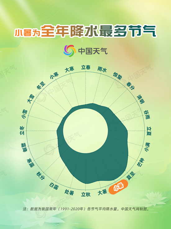 中国天气网统计了1991年至2020年气象大数据发现,除了高温,降水在小暑期间也明显增加,鲜明诠释了“雨热同期”的季风气候特点。数据显示,全年来看,夏末秋初为降雨充沛时段,其中,小暑节气最多,平均雨量达到64.7毫米。