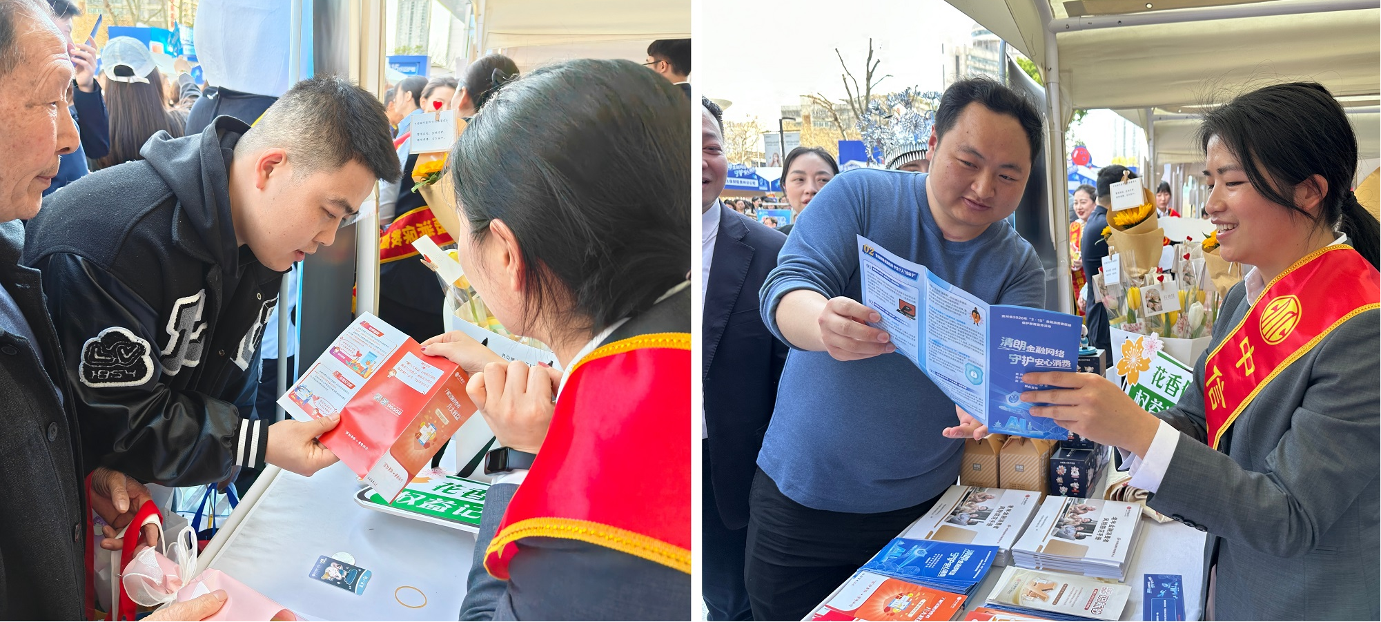 中信银行贵阳分行创新打造“消保花语”主题展台,将春日花艺与金融宣教深度融合。展台以向日葵、郁金香、紫罗兰等鲜花为载体,每束花均搭配专属消保花语卡片,把“理性投资”“信息保护”“反诈防骗”等知识转化为诗意表达,实现“赠人鲜花,手留金融安全”。此外,身着民族服饰的工作人员以通俗易懂的语言现场为市民讲解消保知识,传递消保温度,成为宣传展点的一大亮丽风景线。