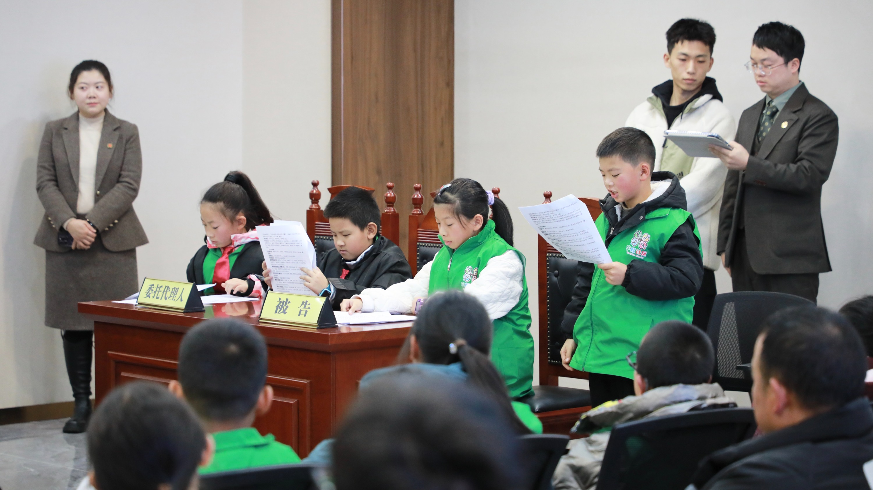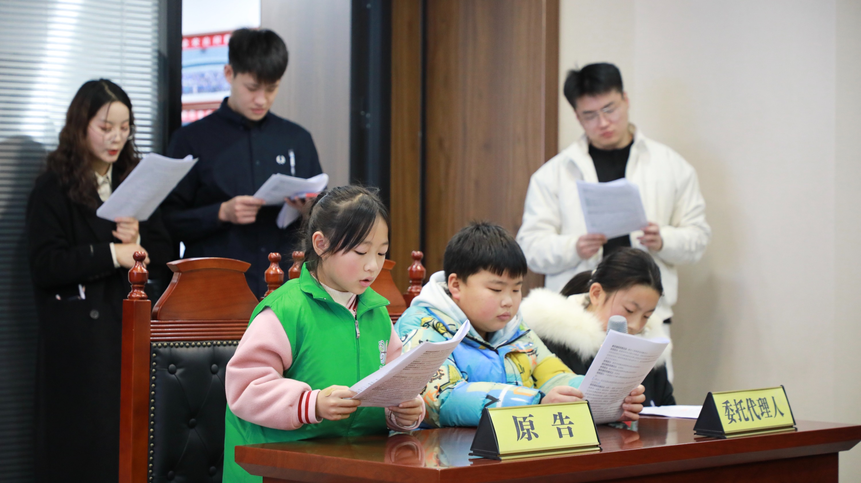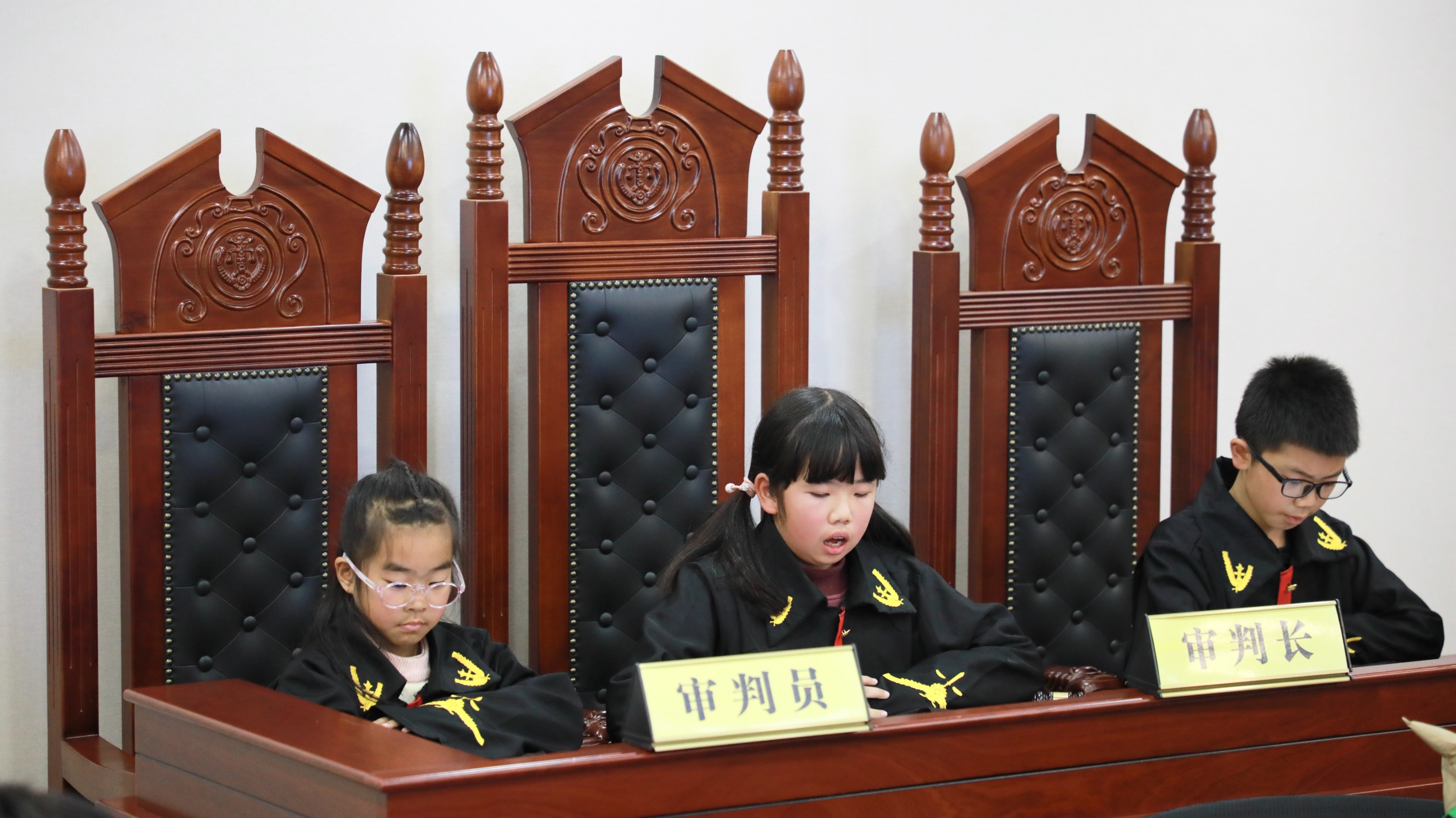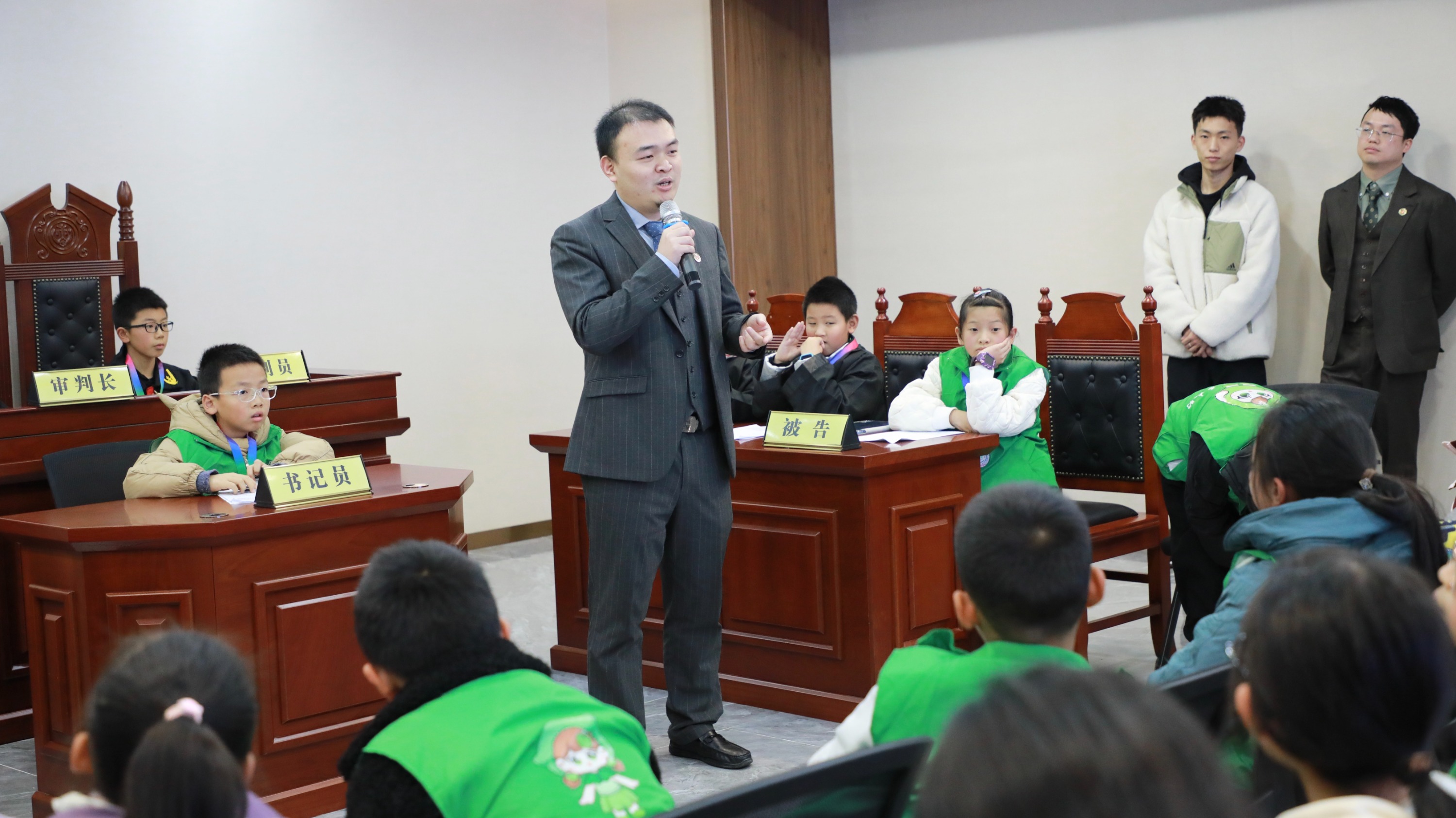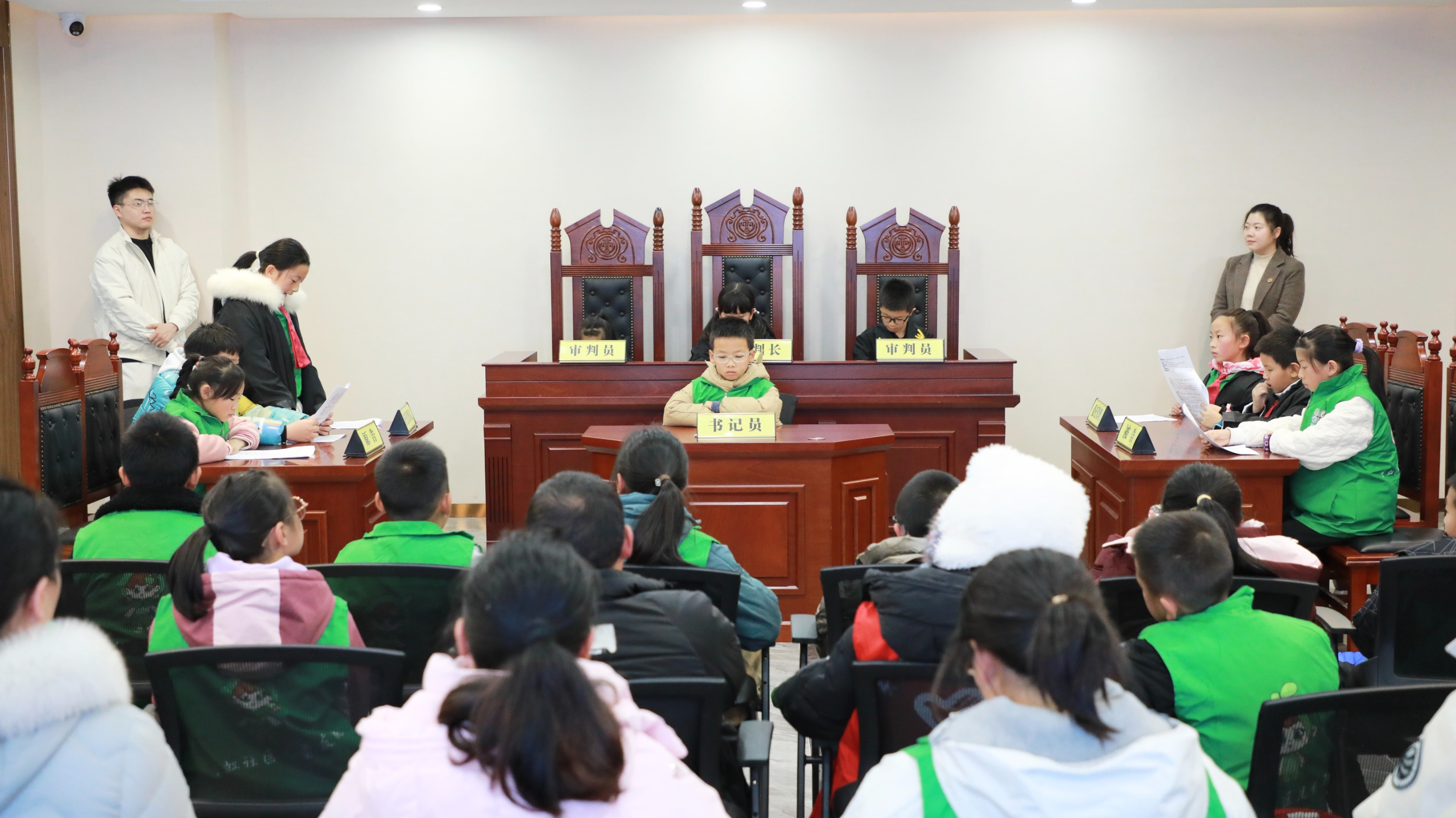 模拟法庭环节,在“小法官”的主持下,原告、被告双方围绕案件事实及争议焦点开展了举证质证、相互发问、法庭辩论等,整个庭审过程庄重严肃、秩序井然,旁听人员神情专注、认真聆听,小朋友“沉浸式”参与了庭审全过程。