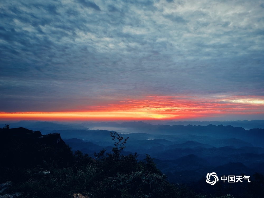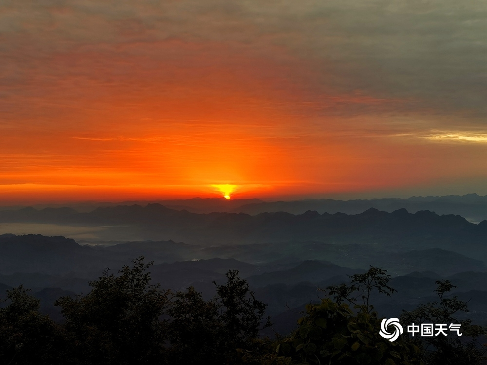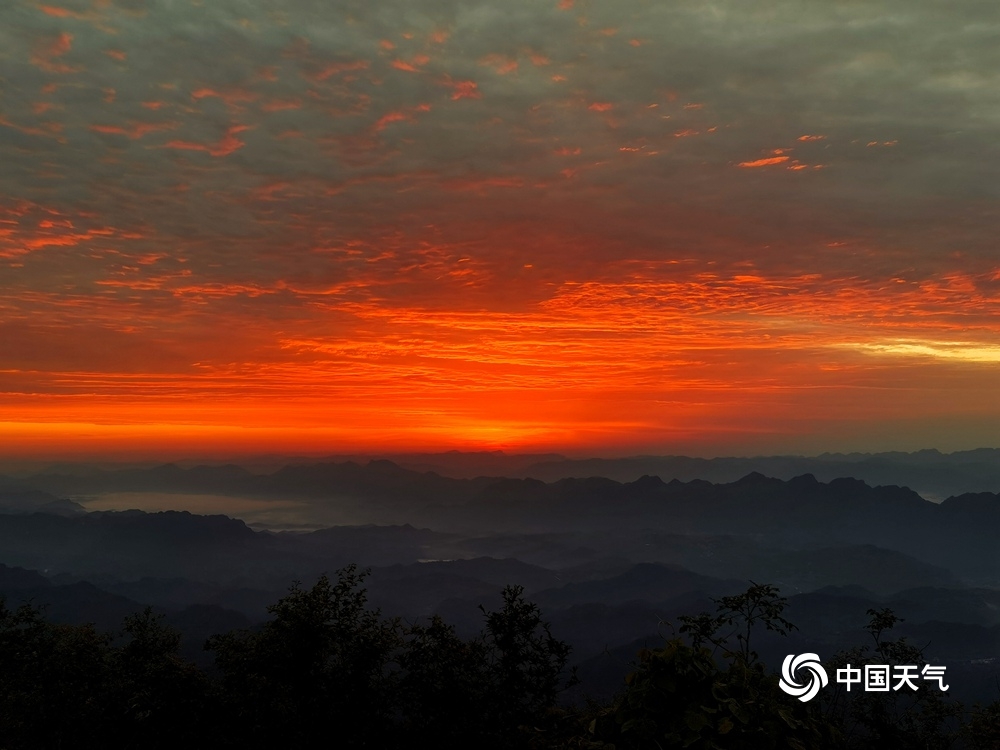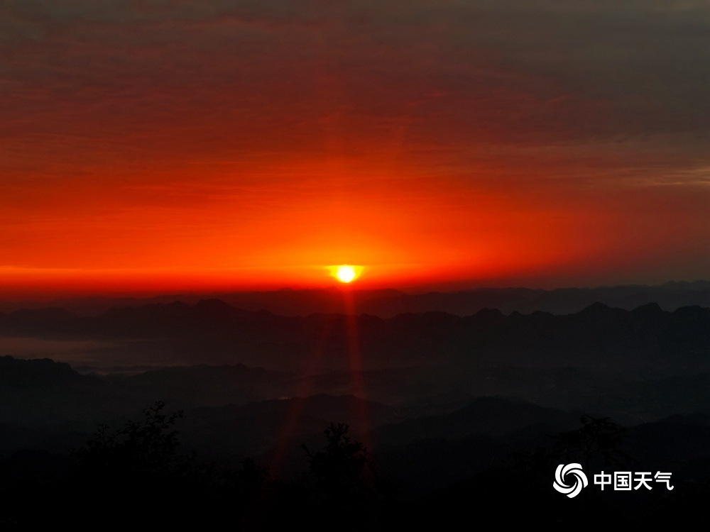 中国天气网讯 6月16日清晨,在湖南省湘西土家族苗族自治州龙山县八面山顶,初升朝阳逐渐透过云层,染红天空,霞光似火,十分壮观。(图/刘玥)