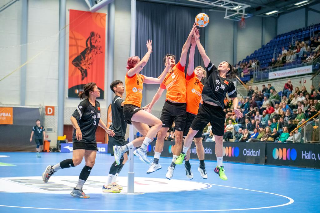 2023年12月27日,中国队球员与荷兰队球员在国际荷球“挑战杯”赛中。