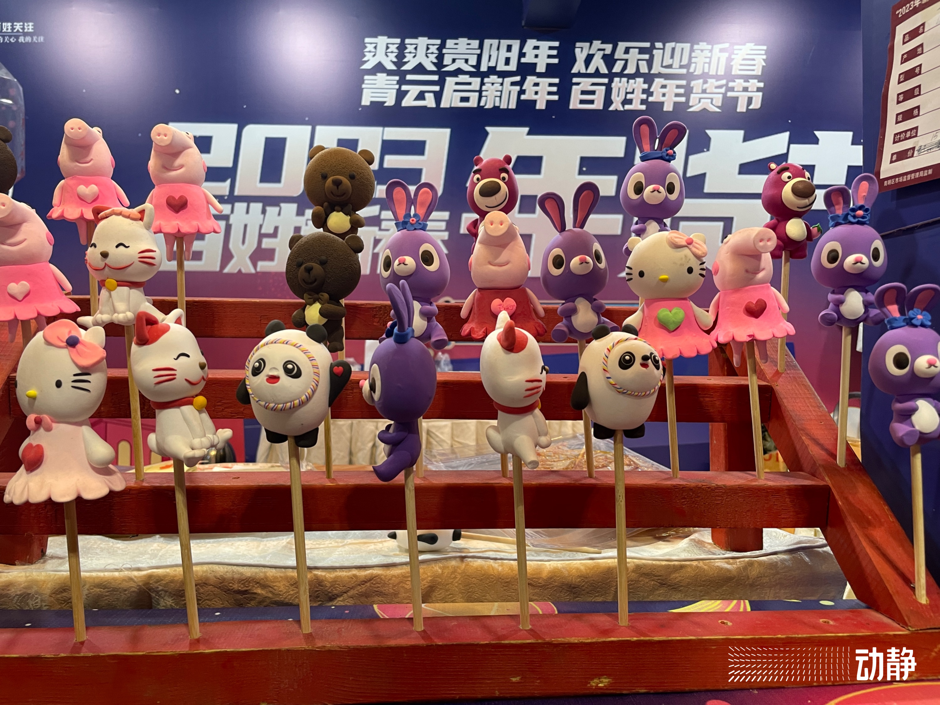 在年俗集市展位,窗花、吊钱、对联、彩灯、中国结、聚宝盆等纷纷开卖,各种产品种类繁多、一应俱全,大小各异的“兔元素”福字、剪纸、兔年卡通玩偶等受到消费者追捧。