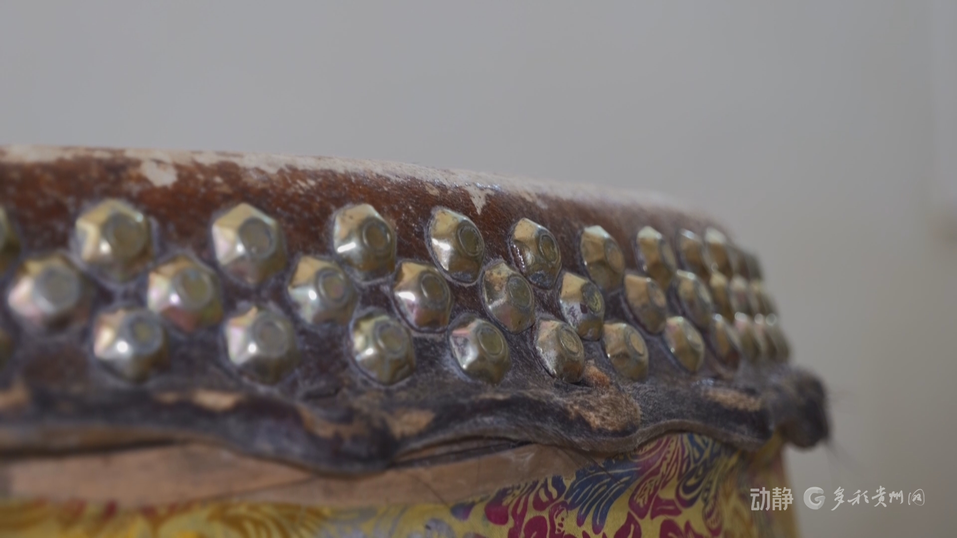 杨明刚正在清洗晾晒灾后的大鼓:“你看,本来鼓钉是非常亮的,现在都锈迹斑斑了。鼓面有一两层保护油,被洪水浸泡之后也脱掉的,你摸一下,现在有点麻了,原来很光滑的。”