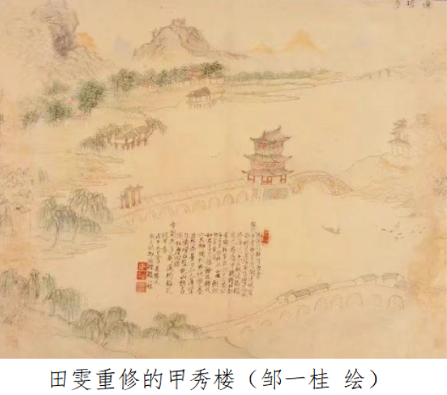 为“振人文,培风景”,体现中央政权对贵州文教事业的关心,康熙二十八年(1689年),田雯决定斥资修葺象征黔中文教却年久失修的甲秀楼,并恢复其名“甲秀楼”,以之期冀黔中“科甲挺秀”,人才辈出。这是甲秀楼的第三次重建。