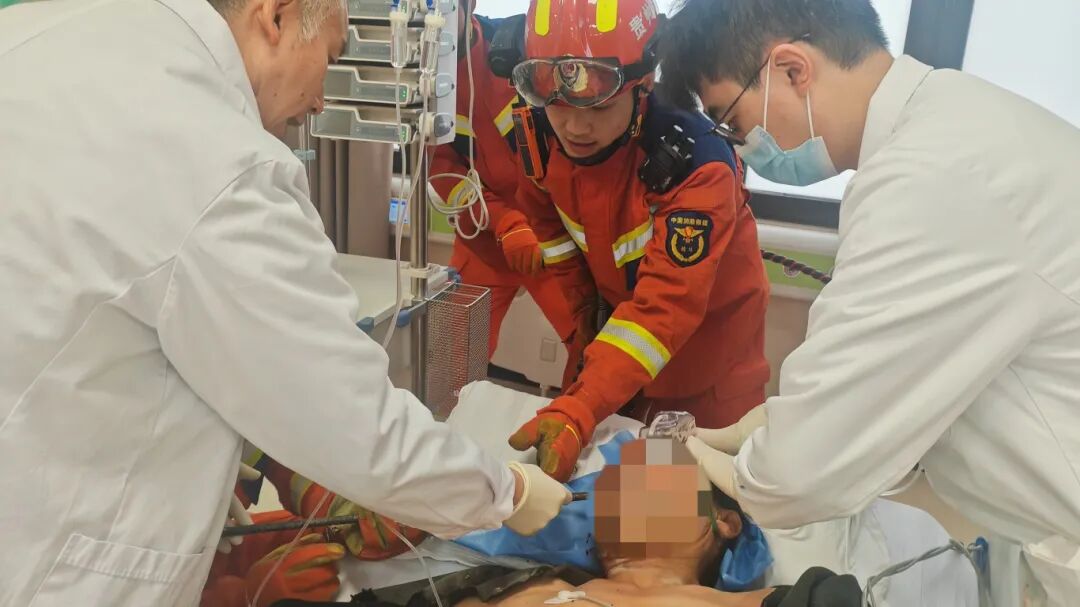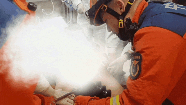 抵达医院后,医生评估发现伤者体内滞留钢筋过长,影响后续手术。经与家属沟通同意,消防员携带专业剪切工具进入急诊室,凭借丰富经验精准操作,分次剪短伤者大腿内外侧及头部外侧的滞留钢筋,严格按医嘱控制残留长度,为救治争取了宝贵时间。