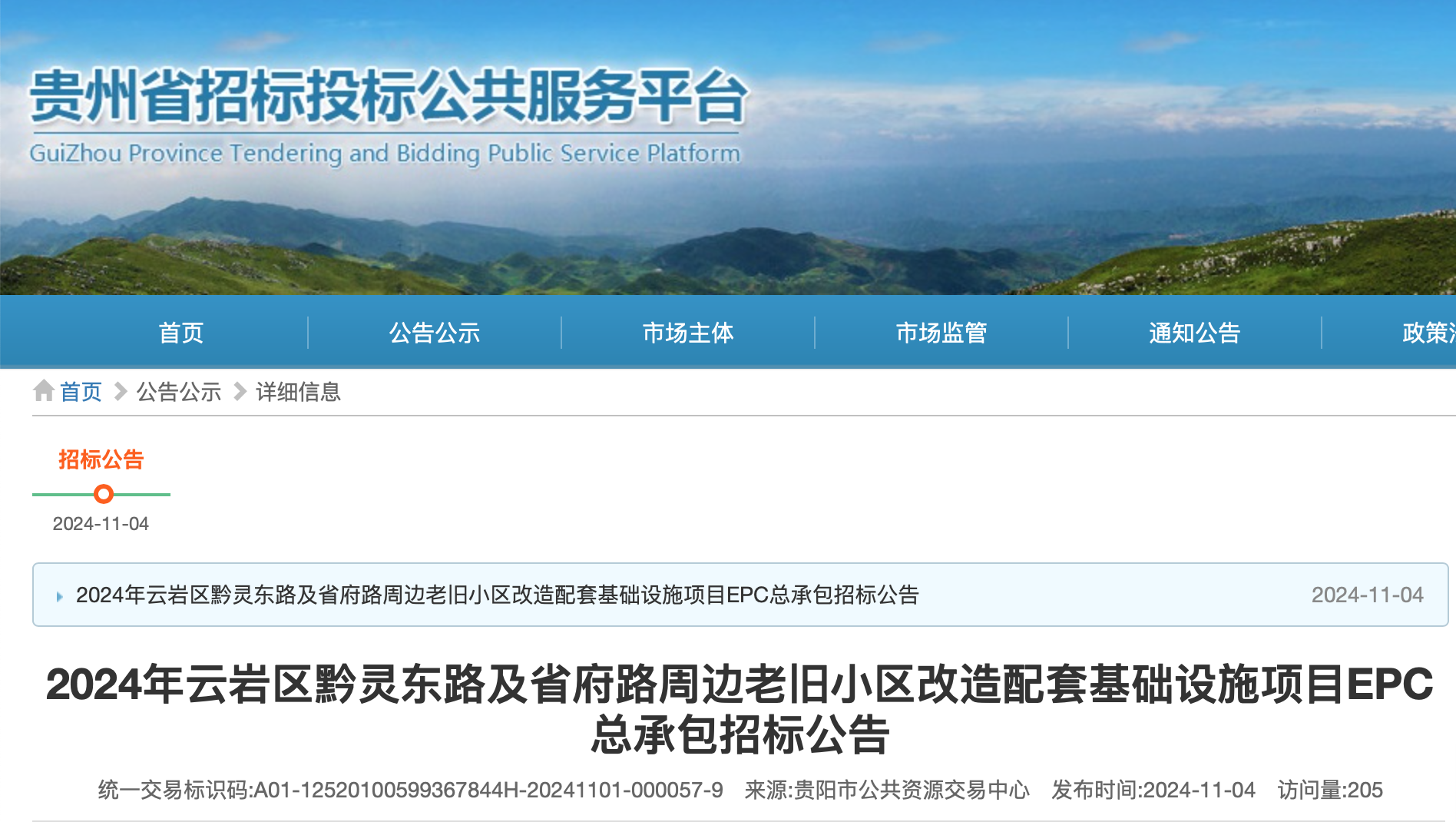 11月4日,贵州省招标投标公共服务平台发布2024年云岩区黔灵东路及省府路周边老旧小区改造配套基础设施项目EPC总承包招标公告,项目总建面为56.68㎡。