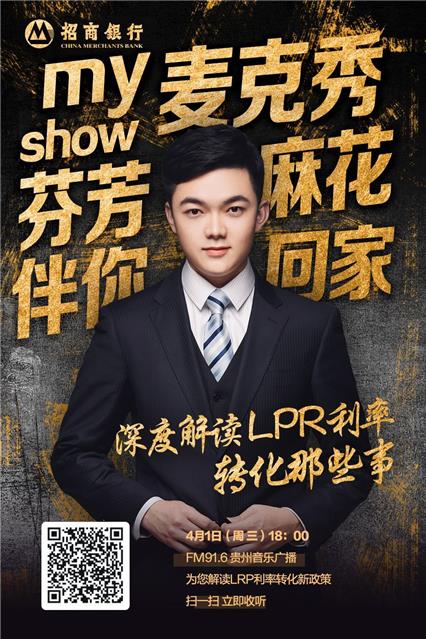 2020年4月1日(周三)18:00-19:00,FM91.6贵州音乐广播晚高峰脱口秀节目《MY SHOW麦克秀》的麻花哥、芬芳姐今日开启“麻芬会客室”,邀请到招商银行贵阳分行零售信贷产品经理张力做客直播间,为您解读更多金融方面的小知识,关于LPR利率转化那些事,让你秒变理财高手。