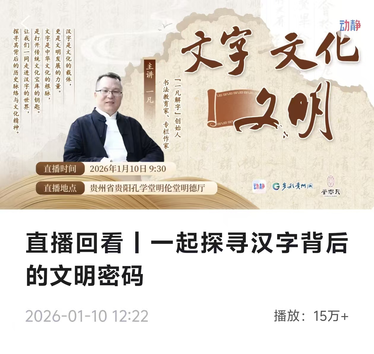 汉字,不只是沟通工具,更是文明密码。1月10日,贵阳孔学堂举办“文字 文化 文明”主题讲座,书法教育家、专栏作家一凡带来生动一课,带领线上线下观众,于方寸笔画间解码汉字背后的文明根脉。贵州省对外文化交流协会学术委员会主任宋青博士担任学术主持。