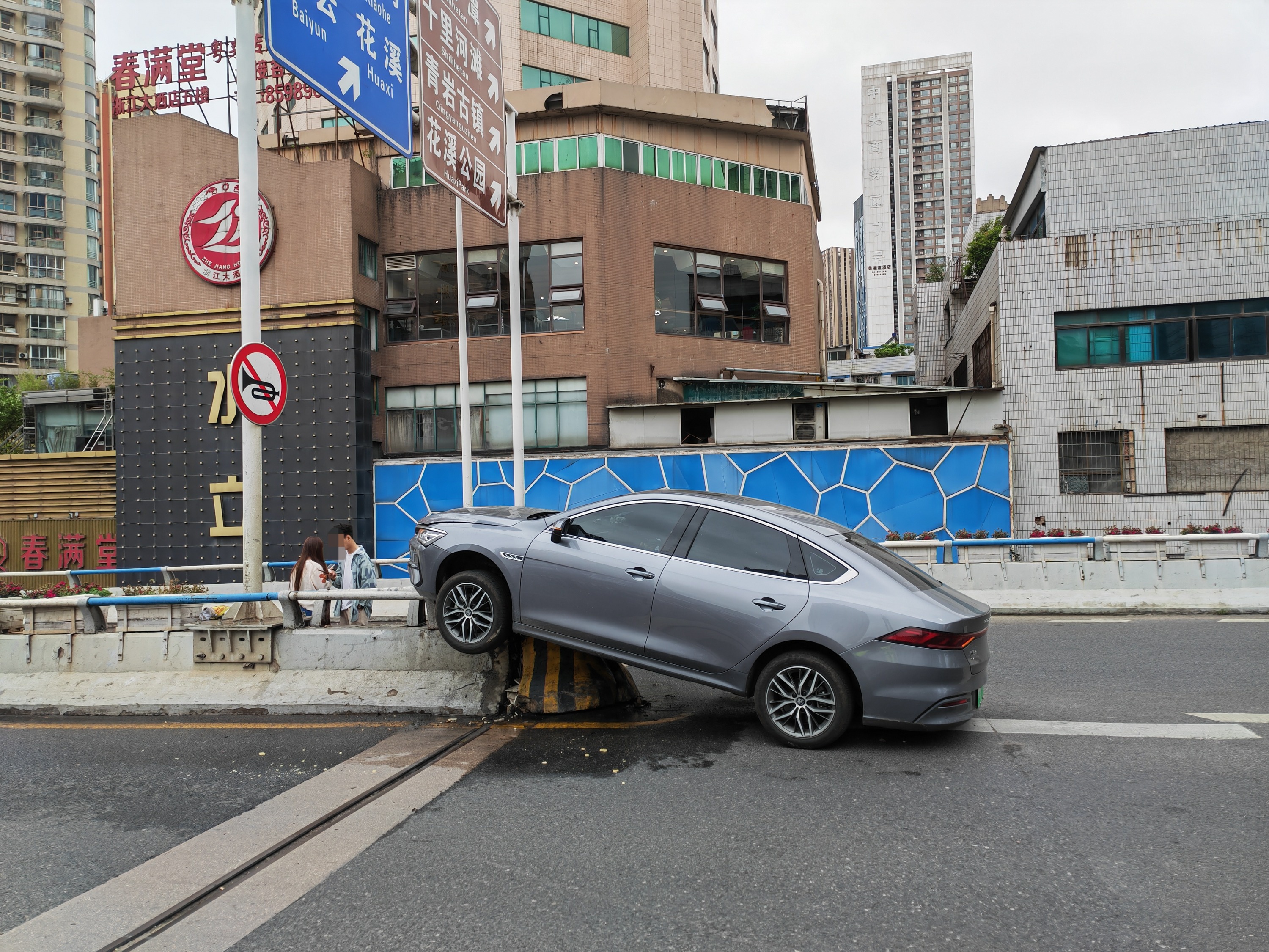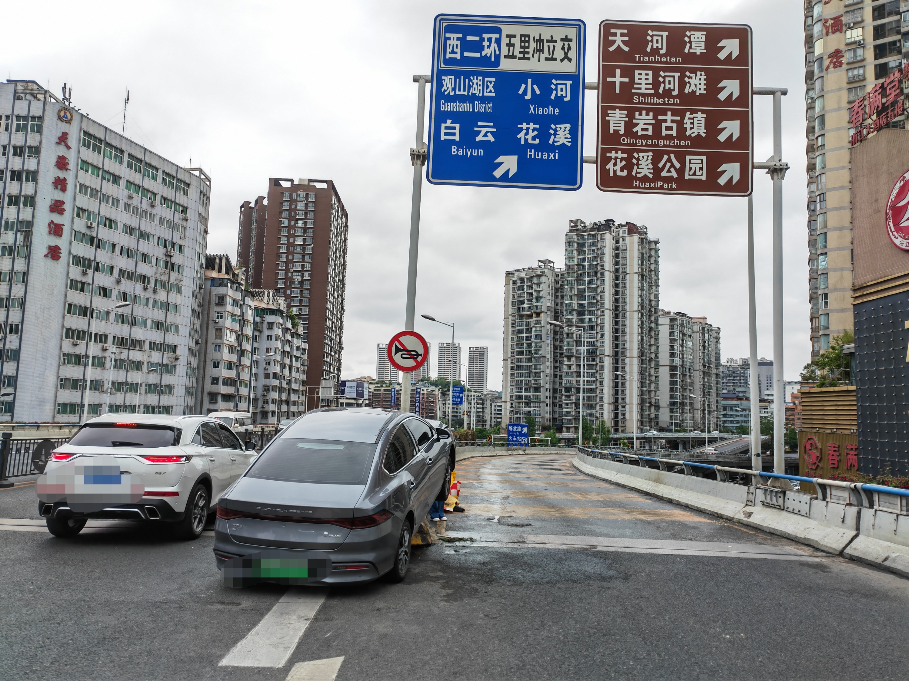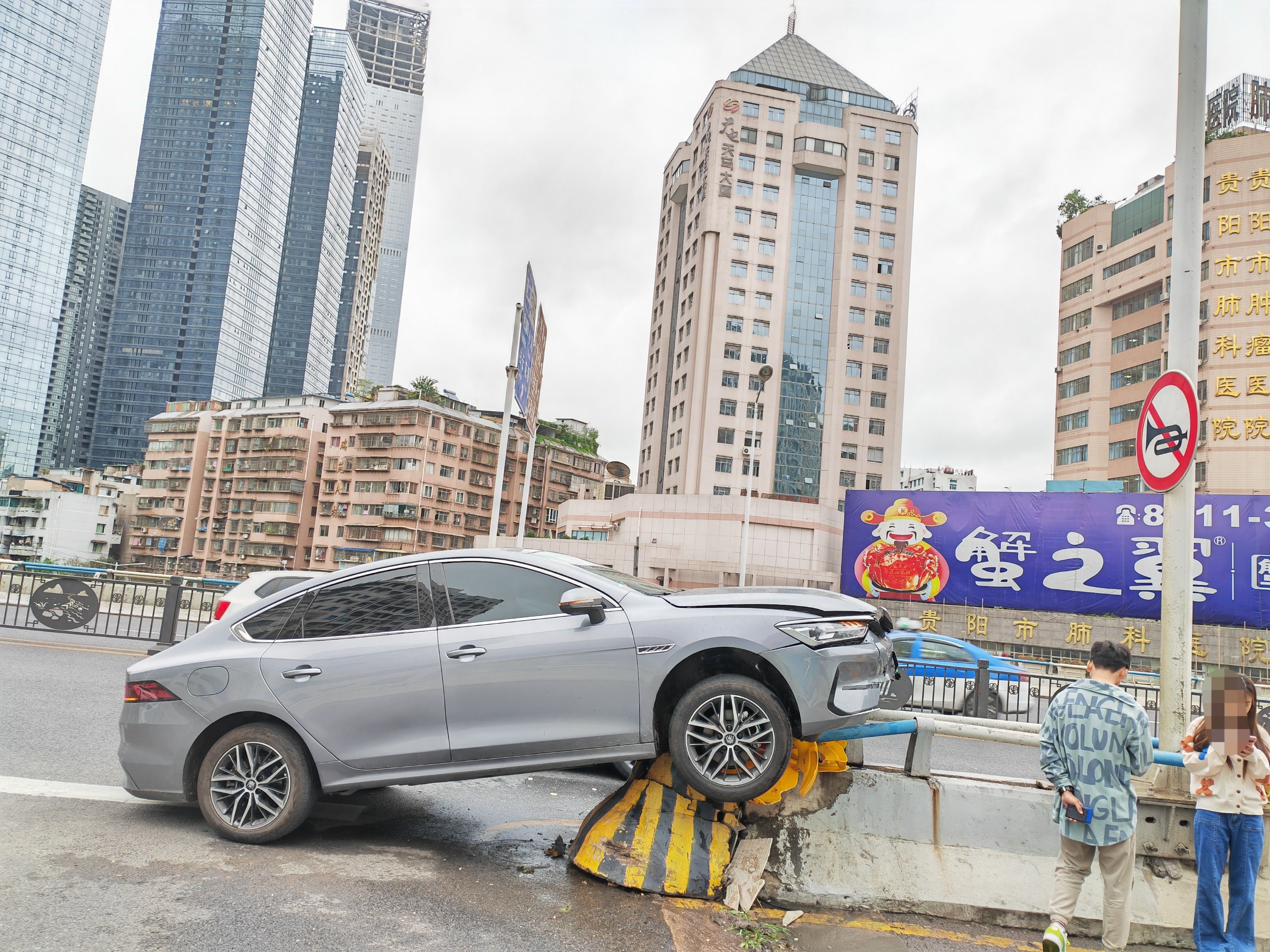 4月24日8时42分,一辆白色小车行驶在花果园立交桥上,在其下花溪大道匝道口处不按规定变更车道,因避让不及冲上道路右侧的导流线区域隔离栏,幸好旁边的防撞桶水马缓冲了撞击力度,且驾乘人员按规定使用安全带,事故仅造成车辆损坏,无人员受伤。南明交警接警后立即前往处置。
