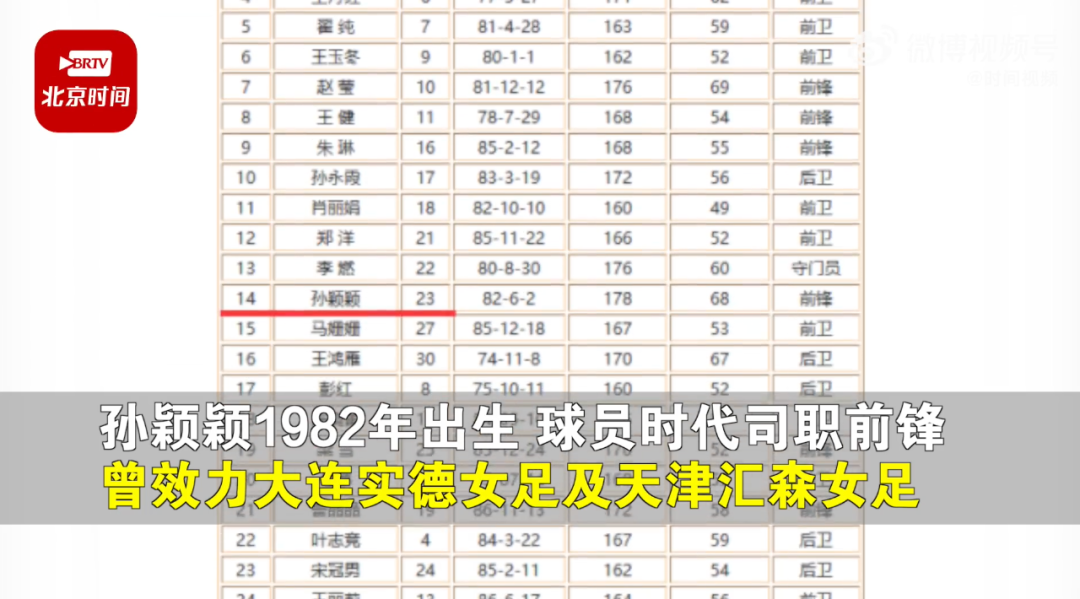 据公开资料显示,孙颖颖1982年6月2日出生,球员时代司职前锋,曾效力大连实德女足以及天津汇森女足。