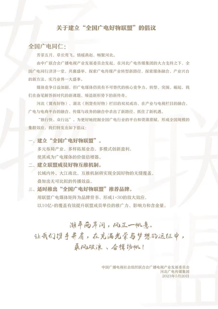 河北《冀有好物》、湖北《荆楚有好物》栏目的成功,归根到底是电视产业化运营及生态圈的巧妙构建,依托“大平台+产业链+融媒体”组团扩能,进而合力致远。在分享会现场,中国广播电视社会组织联合会广播电视产业发展委员会和河北广电传媒集团联合发起携手共建“全国广电好物联盟”的倡议。