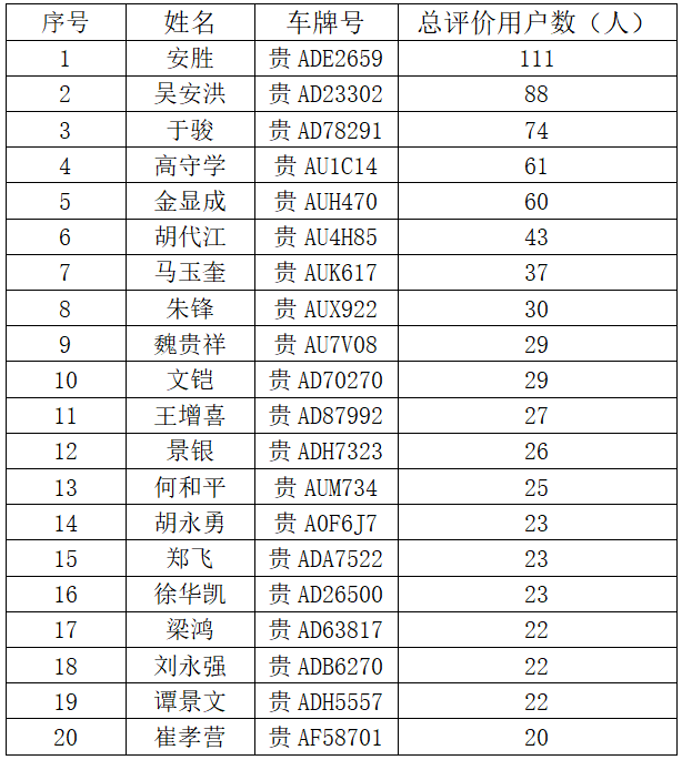 同时,对于积极引导游客对自己的服务进行评价,获得点赞较高的20名“文明好司机”,将由“一码游贵州”平台额外赠送价值158元的贵州特色美食礼包1份。