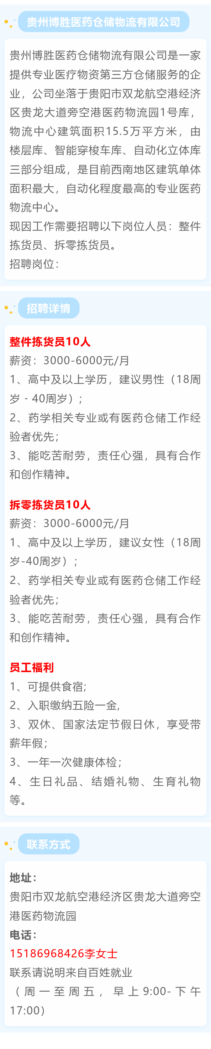 贵州博胜医药仓储物流有限公司招聘!高中起报!五险一金!可提供食宿!