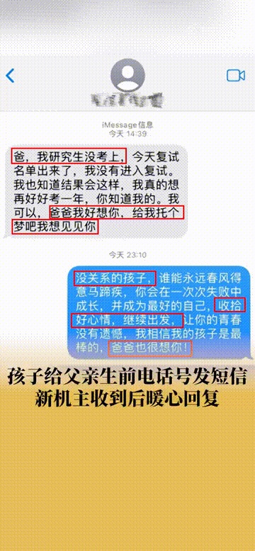 3月26日,陕西西安。孩子给父亲生前使用的手机号码发短信,讲述自己的现状,并称非常想念爸爸。新机主收到短信以其父亲的名义暖心回复,鼓励他收拾好心情,重新出发。收到这条来自“爸爸”的回复,孩子称自己泪目了,并不断表达感谢。当事人高先生说,自己开始以为是对方误发的信息,看了信息的内容后,觉得他现在应该是遇到了一些困难,需要人鼓励,考虑了许久,还是回复了这条信息。希望自己的回复能给他力量,帮助他重拾信心,度过这个难关。