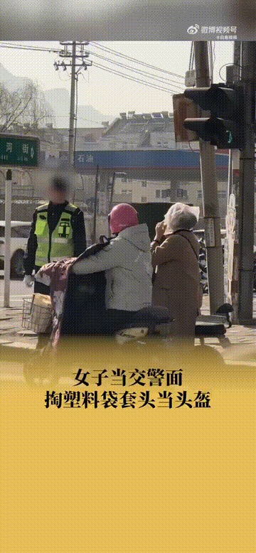 3月27日,辽宁朝阳。女子不戴头盔骑车遇交警,默默拿出了塑料袋套在头上。拍摄者董女士称,看到警察在跟她沟通,猜测应该是劝说佩戴头盔的情况,对方就拿出塑料袋套在自己头上了,怕挡视线还抠出眼睛和鼻子。董女士觉得出行的时候还是应该佩戴头盔,提倡大家安全出行。