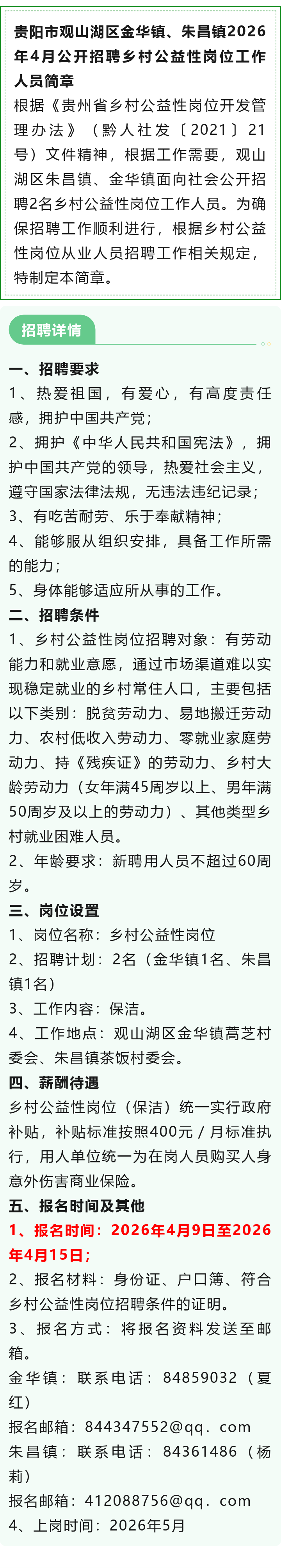 贵阳市观山湖区金华镇、朱昌镇2026年4月公开招聘乡村公益性岗位工作人员简章!