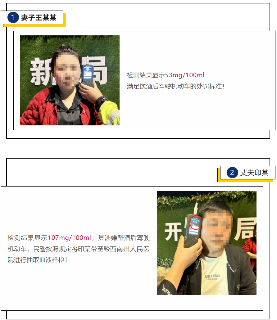 民警立即要求二人靠边停车,配合进一步检测和询问工作。经核实,驾驶员王某某与驾驶员印某系夫妻关系,由于当日朋友新店开业,夫妻俩一同前往店里祝贺,酒足饭饱之后,二人便抱着侥幸心理分别驾驶车辆返回家中,不料半路被执勤民警双双查获。