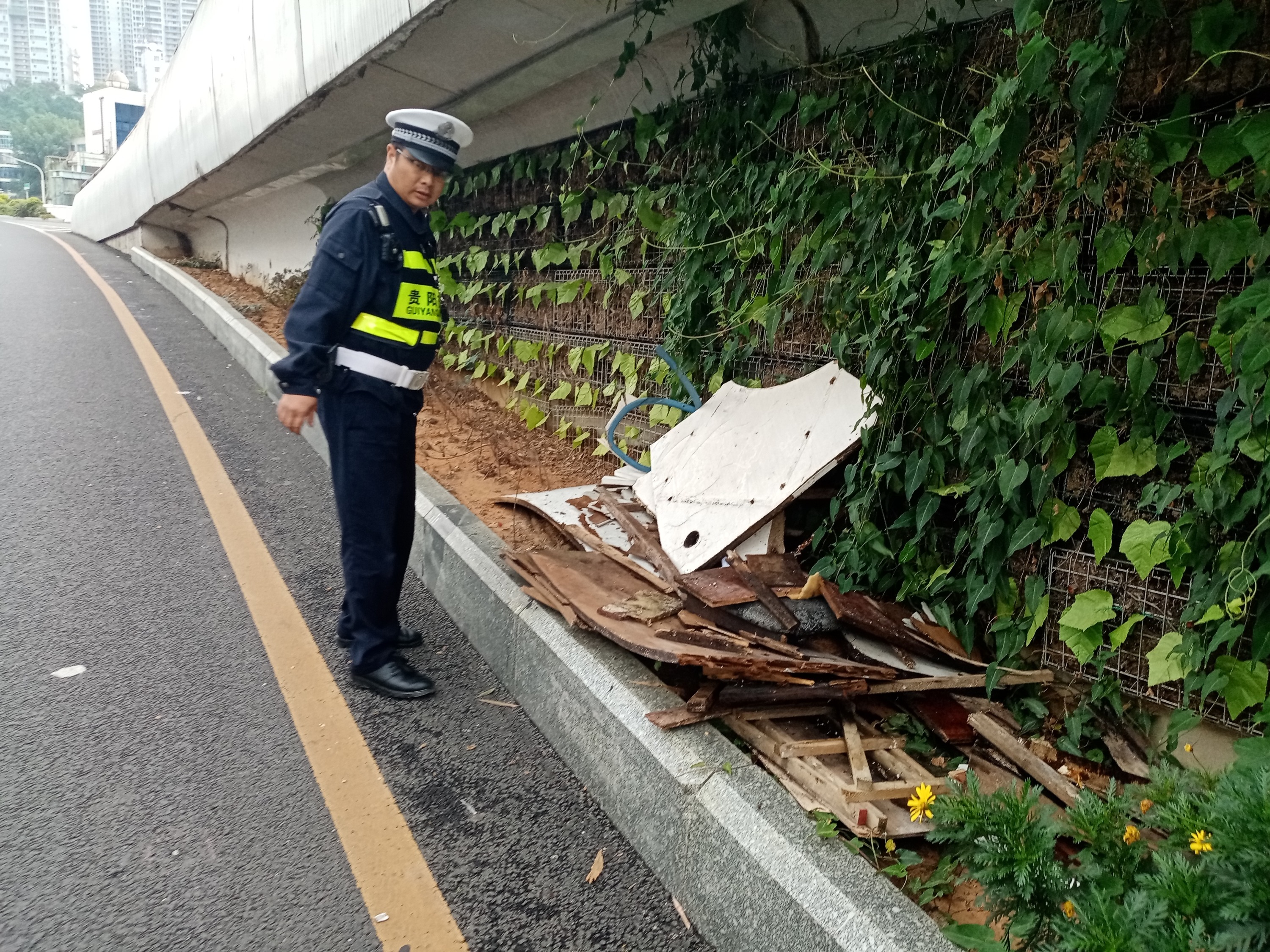 当日11时左右,南明交警二中队执勤人员在人民大道开展道路巡逻工作,巡逻至人民大道河滨隧道出口路段时,发现道路中间有一堆障碍物,民警余德亮,辅警李厚春、周斌立即上前查看,发现是一堆木料垃圾,执勤人员分析可能是货车不小心掉落的,这些掉落的木料垃圾散落在路上,给过往的车辆带来不便的同时,还存在较大的交通安全隐患,容易导致道路交通事故发生。