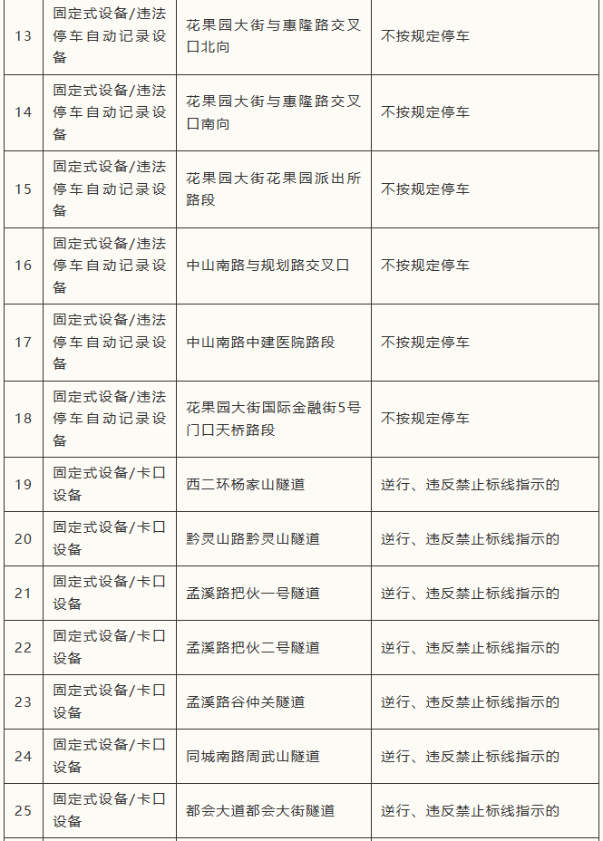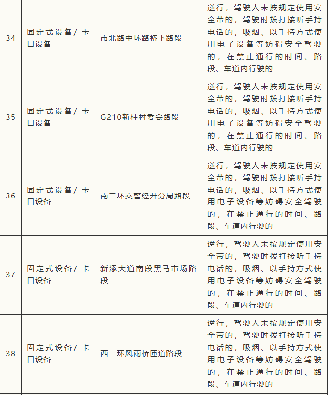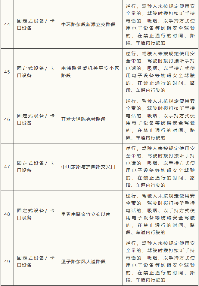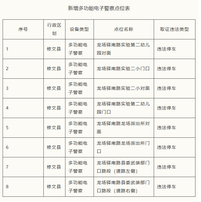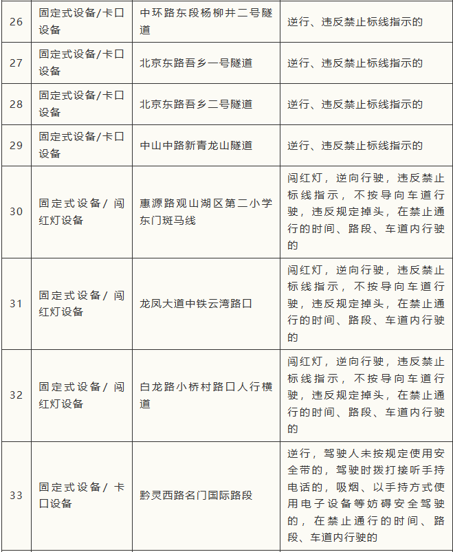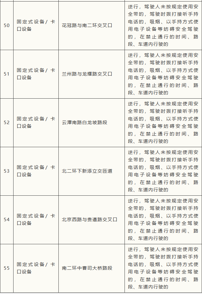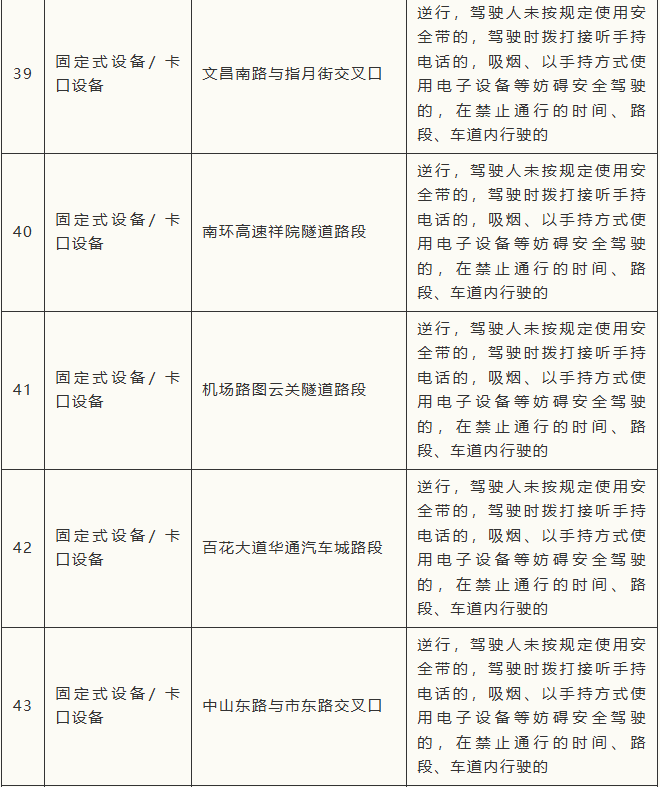 根据《中华人民共和国道路交通安全法》规定,对于设立电子监控设备的路段,应向社会公布安装点位,现将新增电子警察安装点位予以公示(详情见下表),望广大驾驶人依法、安全驾驶(详情见附件)。