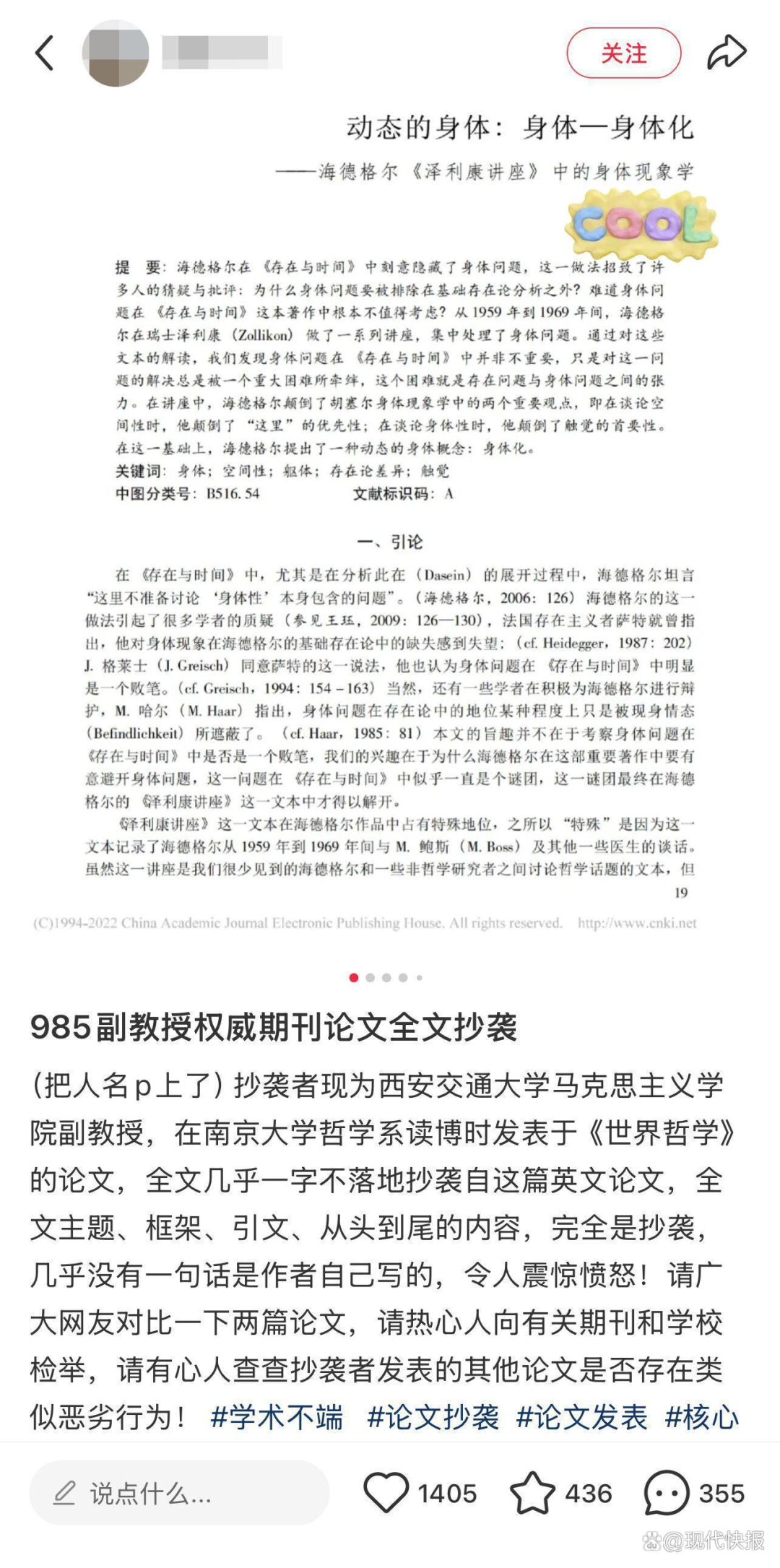 网帖中称,抄袭者现为西安交通大学马克思主义学院副教授,在南京大学哲学系(现为哲学学院)读博时发表于《世界哲学》的论文。“全文几乎一字不落地抄袭自一篇英文论文,全文主题、框架、引文、从头到尾的内容,完全是抄袭,几乎没有一句话是作者自己写的。”