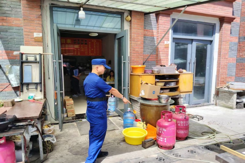隐患排查环节,消防员重点对违规住人、易燃危险物品堆放、乱接电线等问题进行检查。在检查个别商户时,检查人员发现存放多个煤气罐且未采取防火分隔措施的严重安全隐患,当即要求店主整改,并耐心讲解易燃物品集中堆放的危险性。此外,还发现部分商户存在私拉乱接电线、电动车违规充电等现象,消防员皆细心督促和指导商户负责人整改隐患。