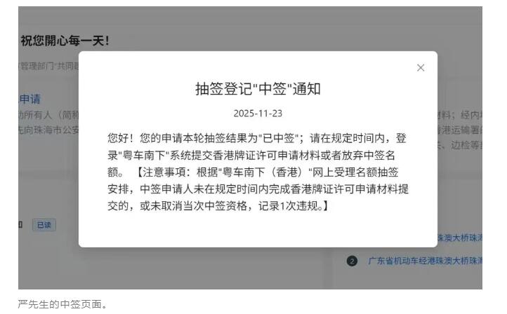 11月23日,“粤车南下”信息管理服务系统正式公布“粤车南下”进入香港市区的抽签结果。此次共有2388人参与抽签,1700人中签。