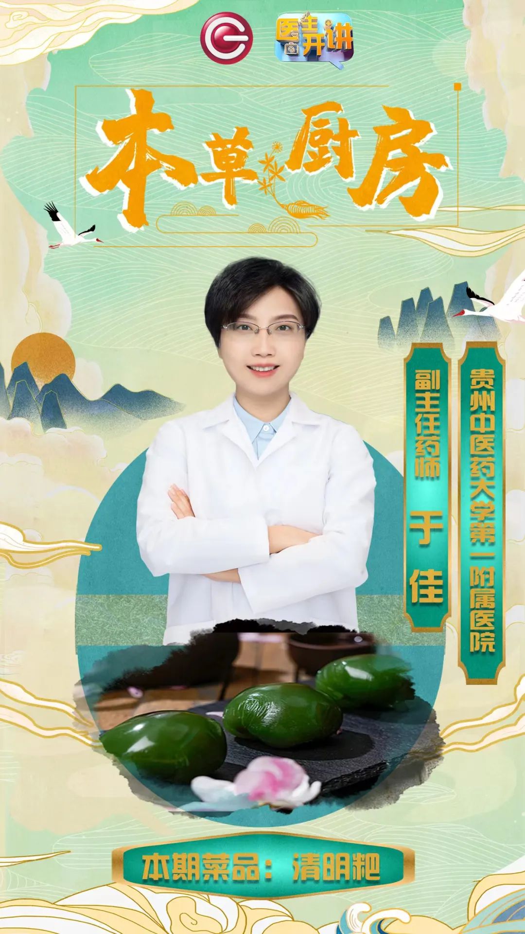 清明,万物生长此时,皆清洁而明净,故谓之清明。也有冰雪消融,草木青青,天气清彻明朗,万物欣欣向荣之意。在今天的《本草厨房》中由贵州中医药大学第一附属医院的副主任药师于佳老师和我们熟悉的赵大厨一起给我们带来的应季美食——清明粑!