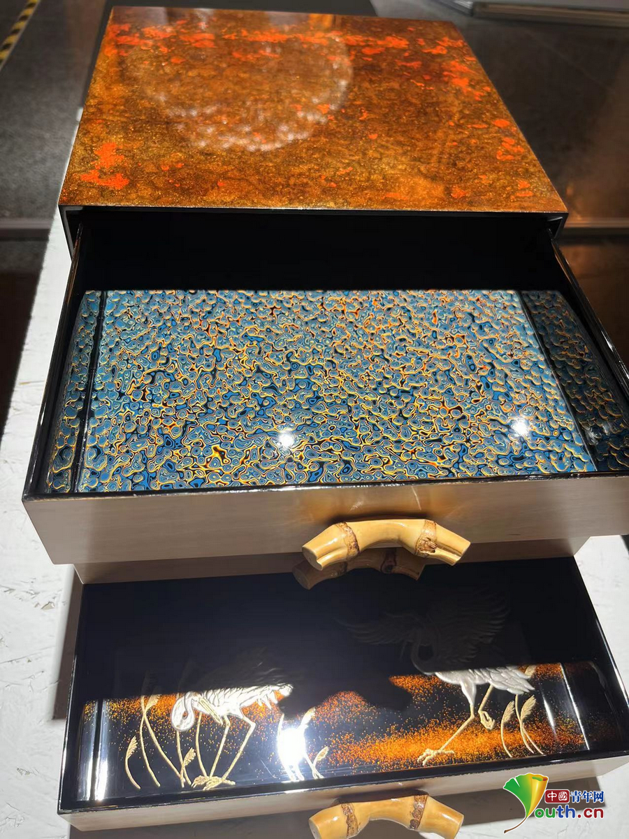 漆工艺类型作品《鹤舞百宝》。作者:王子寿 中国青年网记者 秦亮 摄