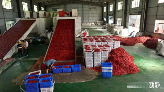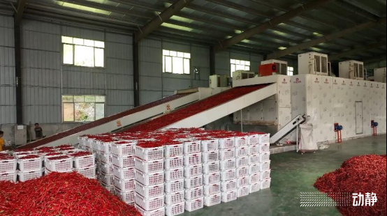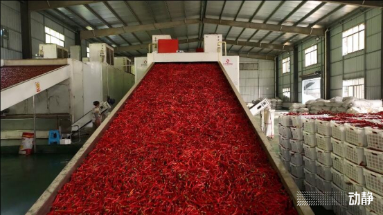 田间采摘忙,车间辣飘香。辣椒的丰收让当地加工厂也“热闹”了起来,在该镇的贵州徐源辣椒实业有限公司烘干厂内,数十万斤鲜椒堆积成山,机器的轰鸣声响彻整个厂房,因辣椒收购量大,工厂的两条生产线正马力全开,加快烘烤。