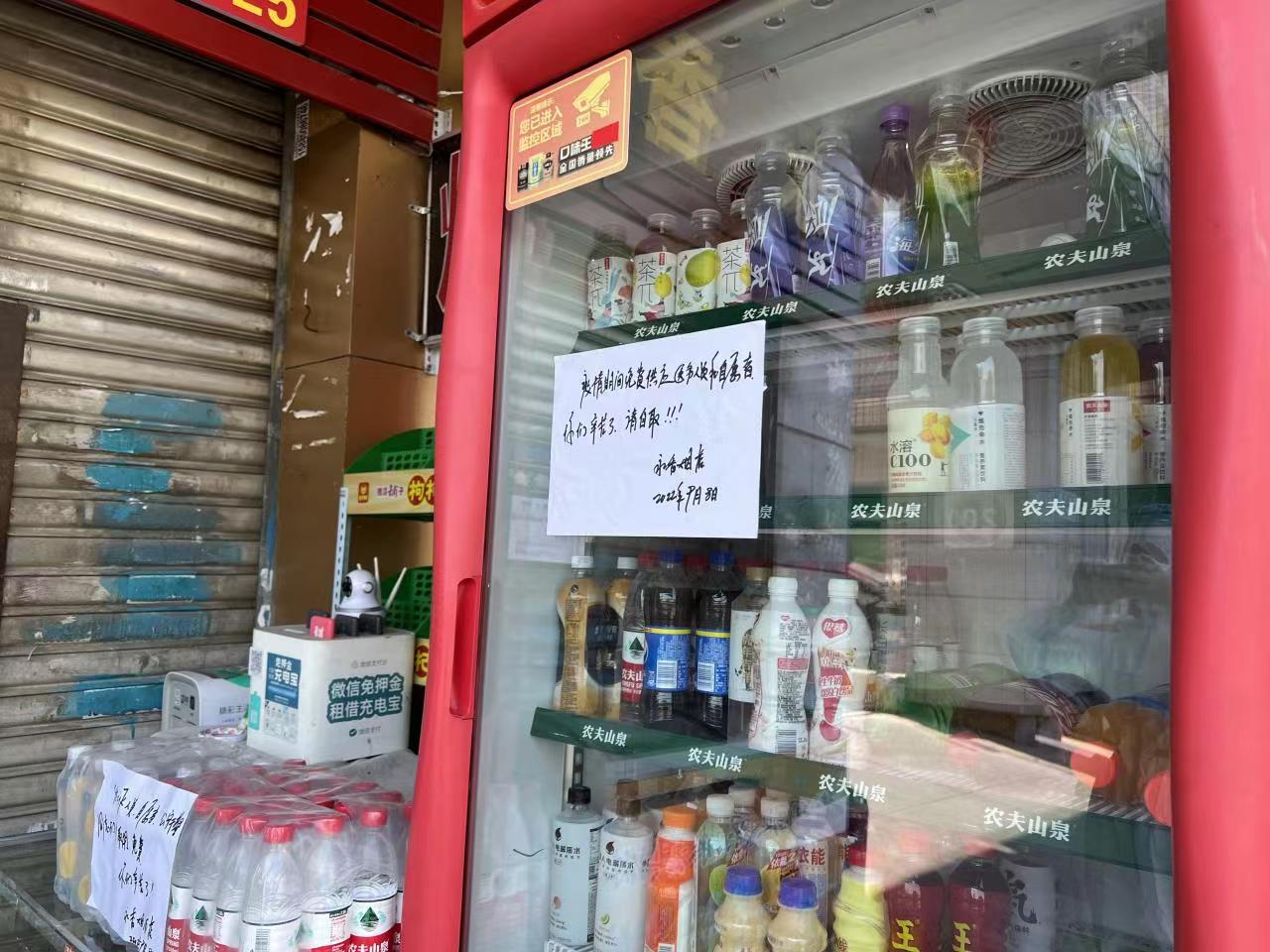 封控了,小卖部响应疫情管控的规定,把门店也关闭了,永香烟酒小卖部的老板把所有饮料都搬出了仓库,放在小卖部门口,免费为医务人员、社区工作者、自愿者、公安民警等,提供冰棍、水、饮料等饮品,并留下一张字条,上面写着“疫情期间免费供应医务人员和志愿者,你们辛苦了,请自取”的字样。