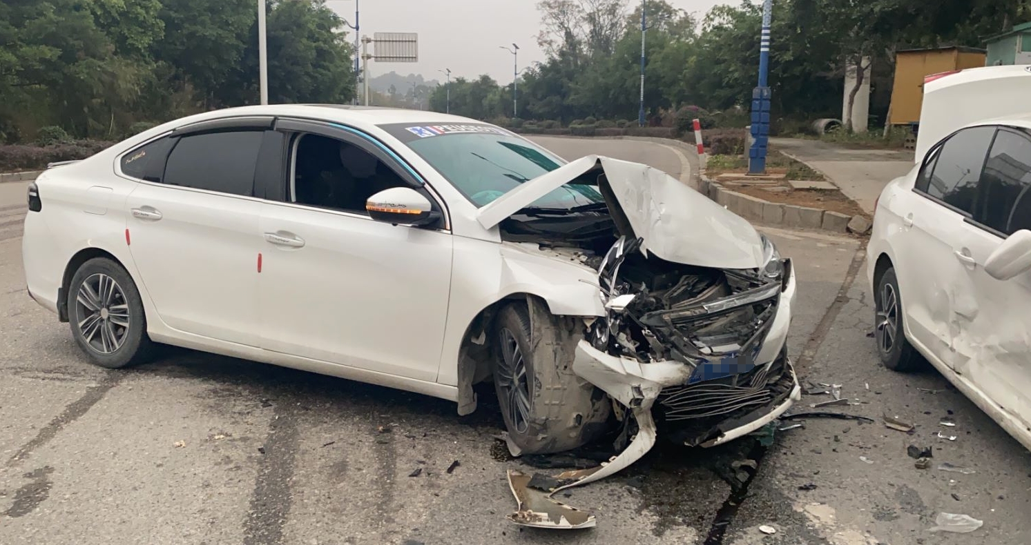 在现场,只见两辆小轿车停在杨家山路段的Y字岔路口处。两车的前排安全气囊均弹出,其中一车的前引擎盖翘起,车头已经变形;另一辆车的左侧车门有明显凹陷,左前轮已经爆胎,两车周边散落着损坏的零件,现场一片狼藉。