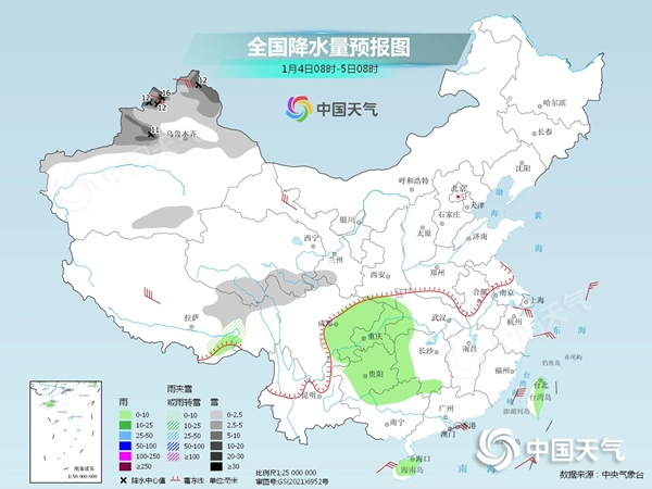 今起三天,我国降水区域仍将集中在西南地区,新疆等部分地区降雪也比较频繁。其中今天,新疆北部、西藏东南部、青海中部、甘肃南部、陕西西南部等地部分地区有小到中雪或雨夹雪,其中,新疆北疆北部等高海拔地区有大到暴雪(10~16毫米)。四川盆地、重庆西部、贵州中西部、云南东部、海南岛、台湾岛等地部分地区有小雨。