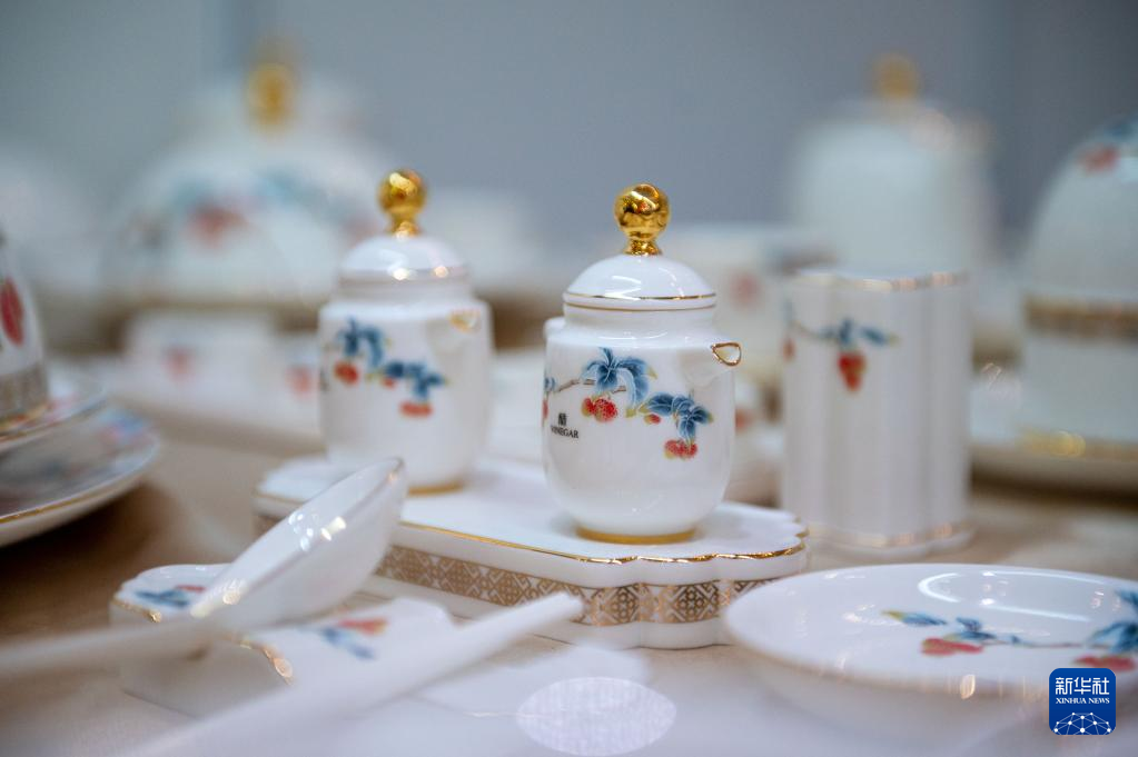 这是2月13日在马来西亚雪兰莪州举办的“中国白·德化瓷”专题展会上拍摄的“荔兴南国”宴会瓷具。