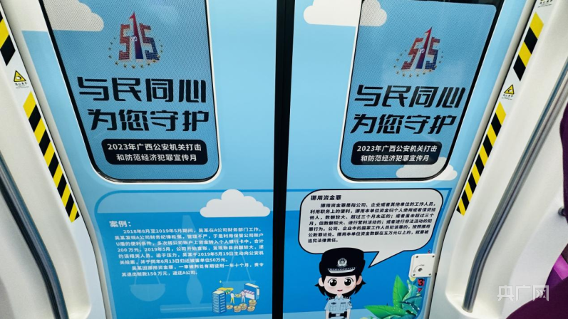 “上下班通勤过程中还能学习到防范经济犯罪的知识,而且都很通俗易懂,这无论是对于我们这些上班族,还是已经退休的大爷大妈来说,都是非常有用的。”5月13日,广西公安机关打击和防范经济犯罪主题宣传列车“经侦号”正式在南宁地铁3号线开行,乘坐首趟“经侦号”列车的南宁市民潘绕科说。