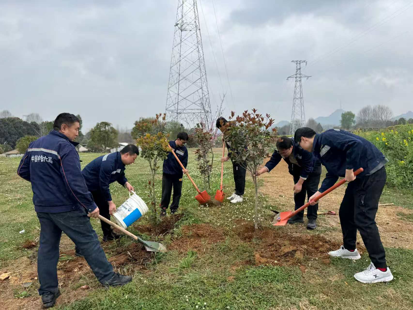 植树现场,有人挥锹挖坑、整平树穴,有人扶苗定干、校准姿态,有人培土夯实、固牢根基,有人提水浇灌、滋养新苗,每一道工序都认真细致、规范有序。经过共同努力,一棵棵小树苗迎风挺立,在微风中轻轻摇曳,为项目周边的土地披上了崭新绿装,也让绿色发展理念在一线员工心中落地生根。