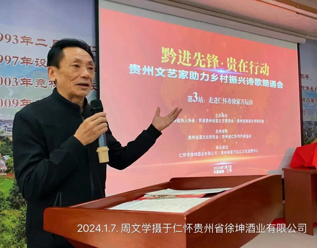贵州文艺家助力乡村振兴诗歌朗诵会第3站走进中国酒都徐家万坛山活动由贵州省诗人协会公益形象大使、贵州省朗诵文学研究会副会长兼秘书长周进主持。