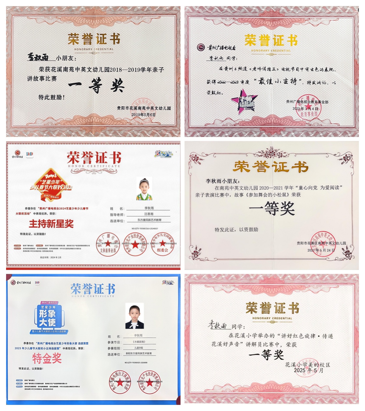 15.2025年12月,第四届“2026贵州广播电视台艺星少年小主持人大赛暨2026年少儿春节大联欢小主持选拔赛”“特金奖”。