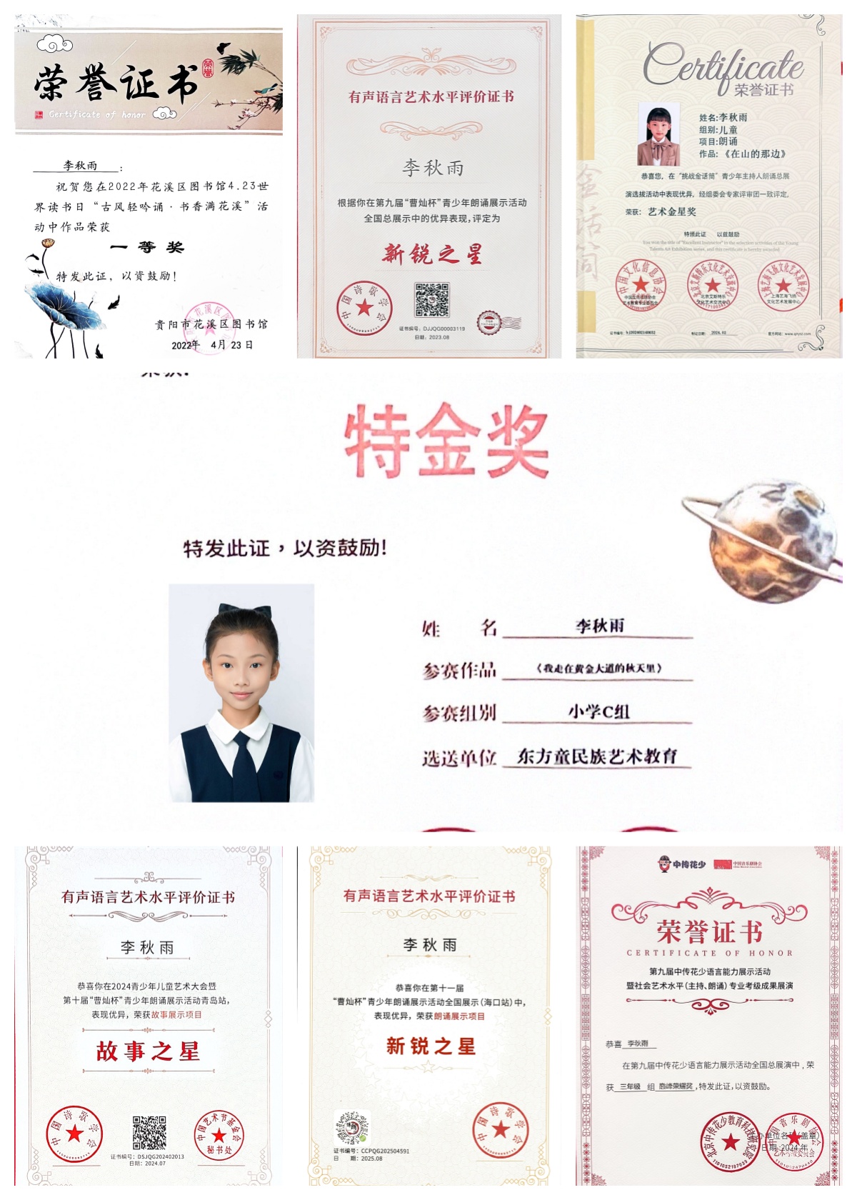这份沉淀,给了我走向更大舞台的勇气:从校园活动到全国赛事,从录制贵州电视台《我为贵州代言》《小小科普官》,到参与2024年和2025年艺星少年少儿春节大联欢……每一次灯光亮起,都是珍贵的成长。一路走来,我也收获了许多鼓励。