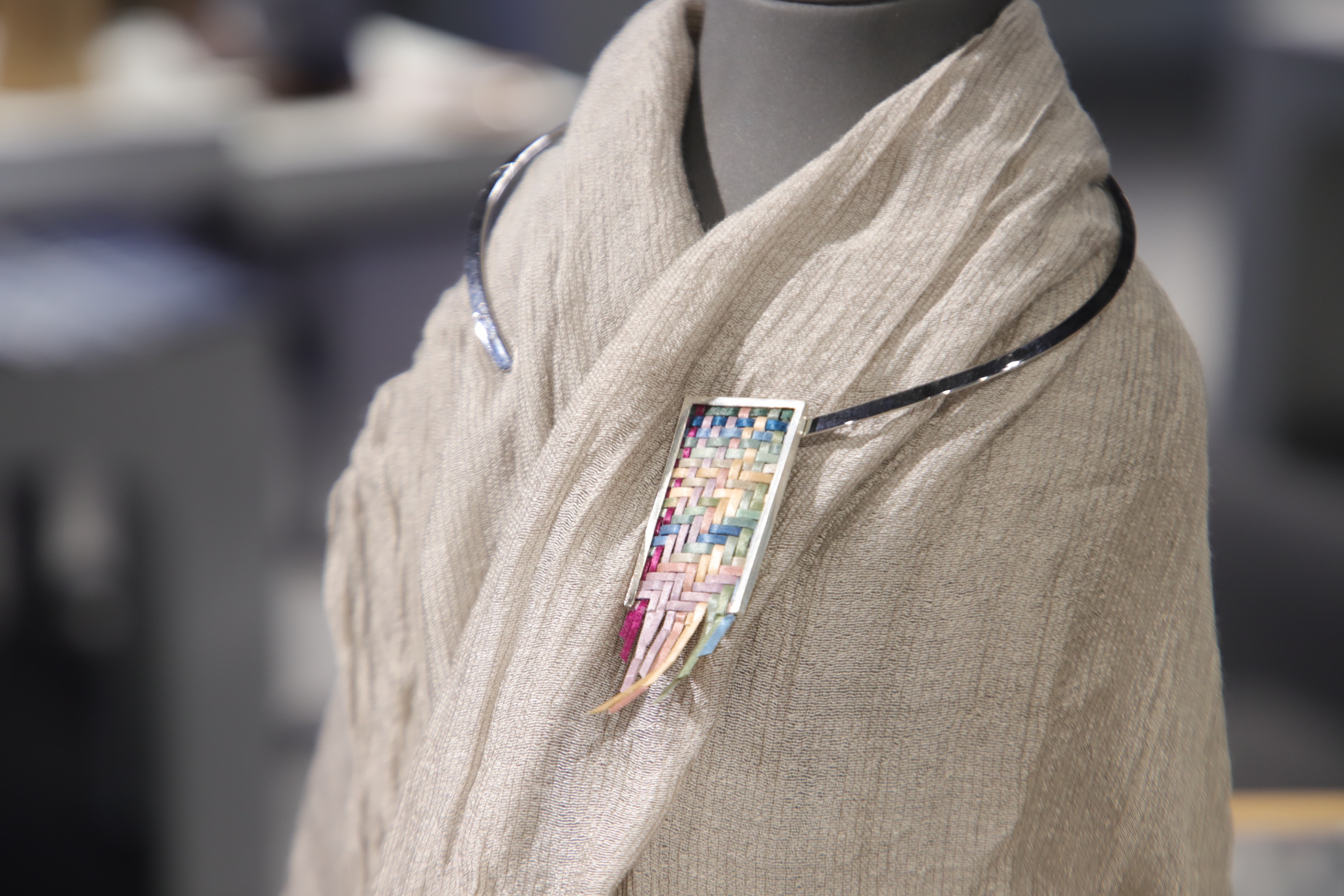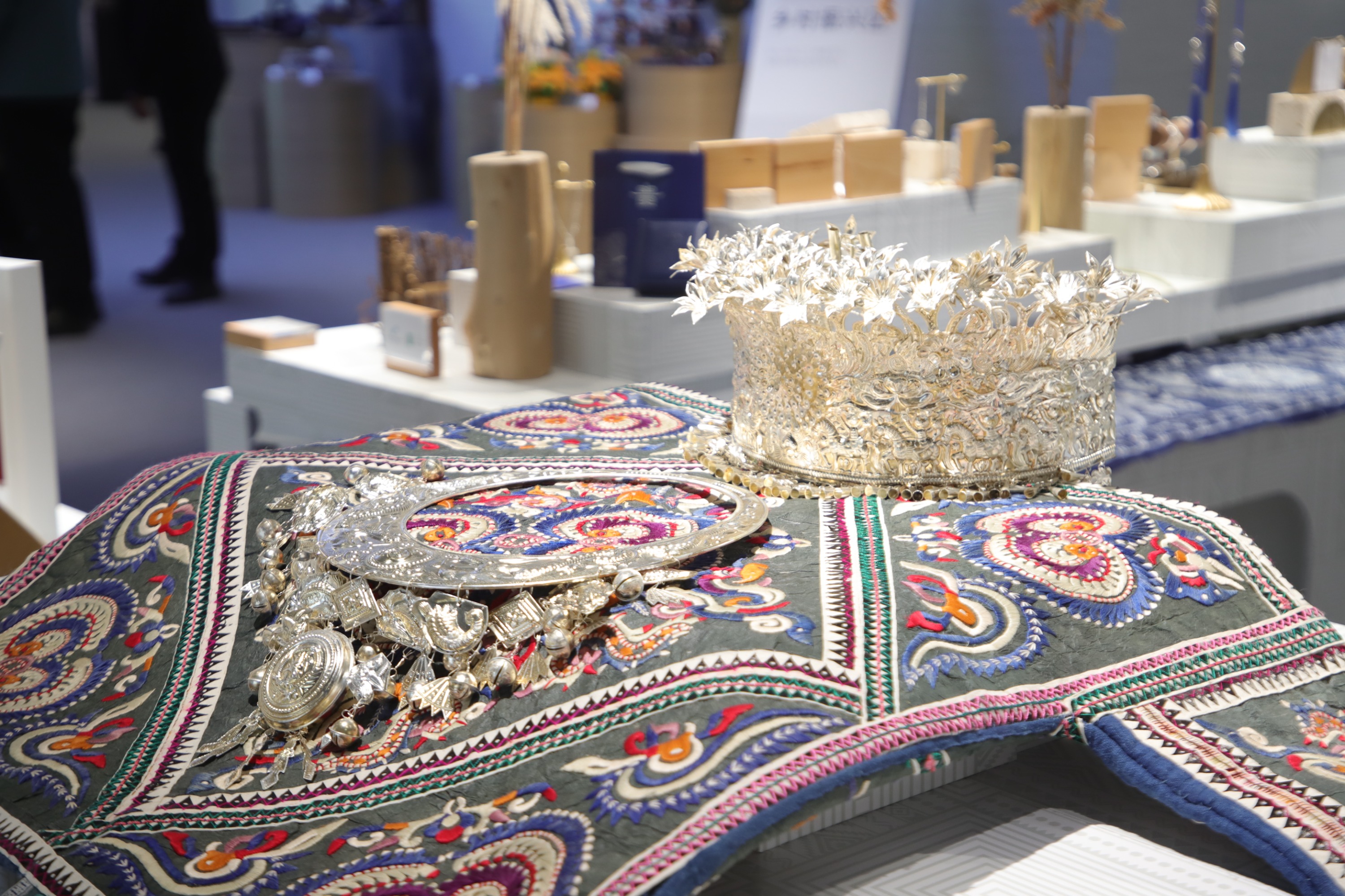 店内一个个小巧而精致的胸针引起了记者的兴趣,这是由编织和银饰工艺相结合的方式创作而成,经过精心设计,心灵手巧的工艺创作者们以贵州黔东南地区苗族的丝绫材质代替竹材,保留原有工艺,既能传达出原有工艺特质,又能呈现出纤维艺术的崭新面貌。