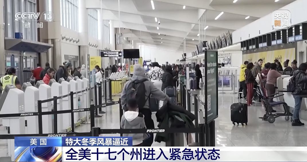 随着一场大规模冬季风暴的逼近,截至24日中午,美国全国已有17个州宣布进入紧急状态。据称,24日、25日两天美国全国数千架次航班取消。