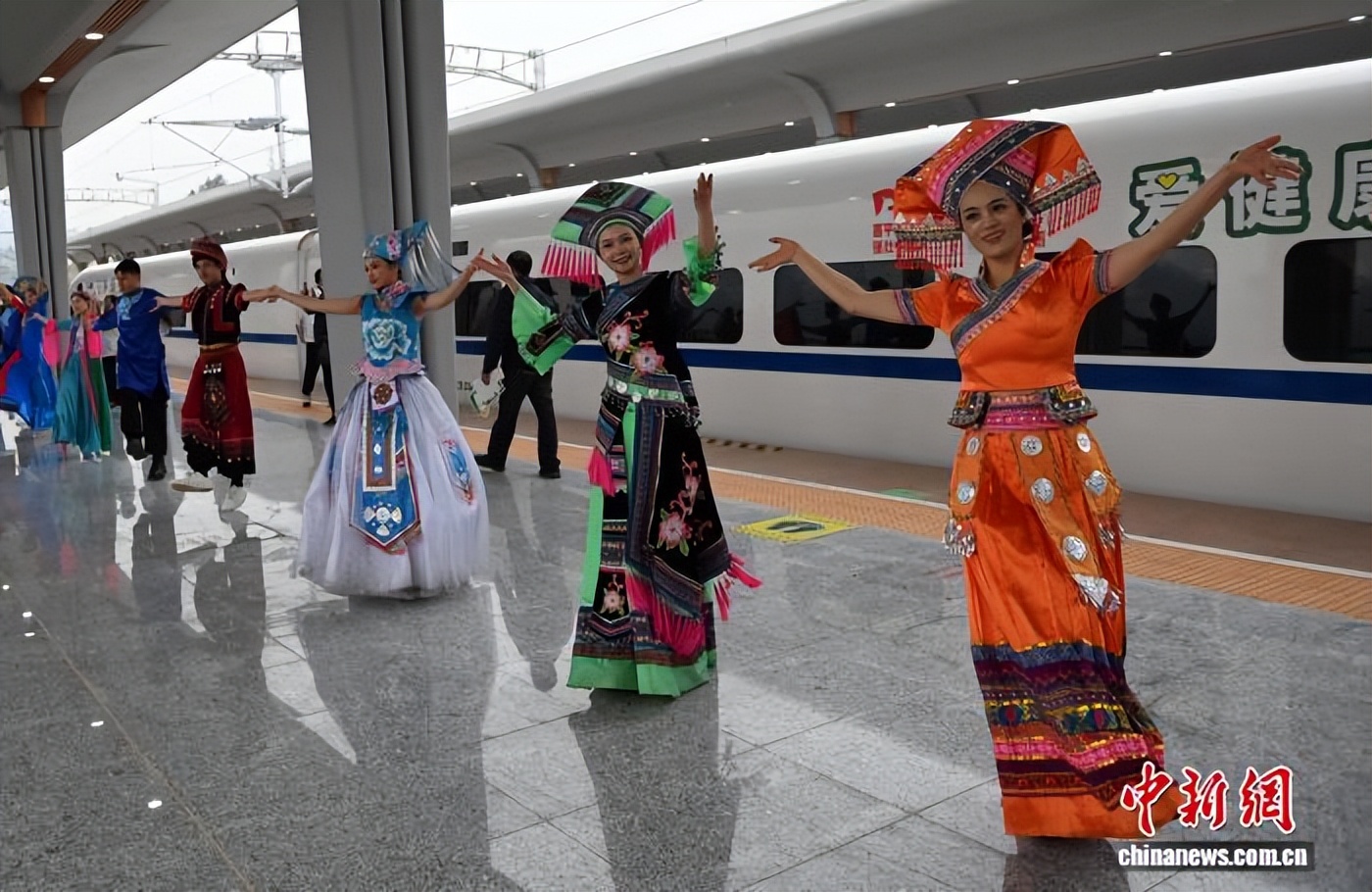 12月5日,南宁至凭祥高铁崇左至凭祥段正式开通运营。至此,南凭高铁实现全线贯通。图为民众载歌载舞庆祝南凭高铁全线贯通。中新社记者 蒋雪林 摄