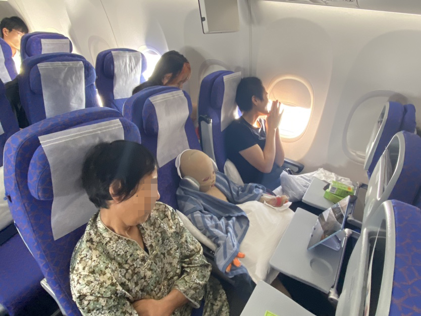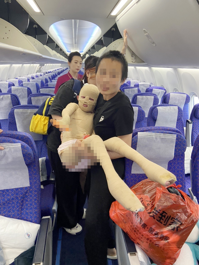 经乘务长陈馨和组员马婷婷与孩子家长交谈当得知,被烧伤的孩子叫可可,原本是个聪明可爱的6岁女孩。今年3月,她和弟弟蛋蛋睡觉时,由于家里线路在半夜三点老化起火,导致两个孩子都被烧成重伤。历经北京、长沙等地多次抢救治疗,目前可可已经出院,但弟弟至今仍在重症监护室中尚未苏醒。因此,家人决定先带可可乘机回家休养,减轻在外就医的部分负担。