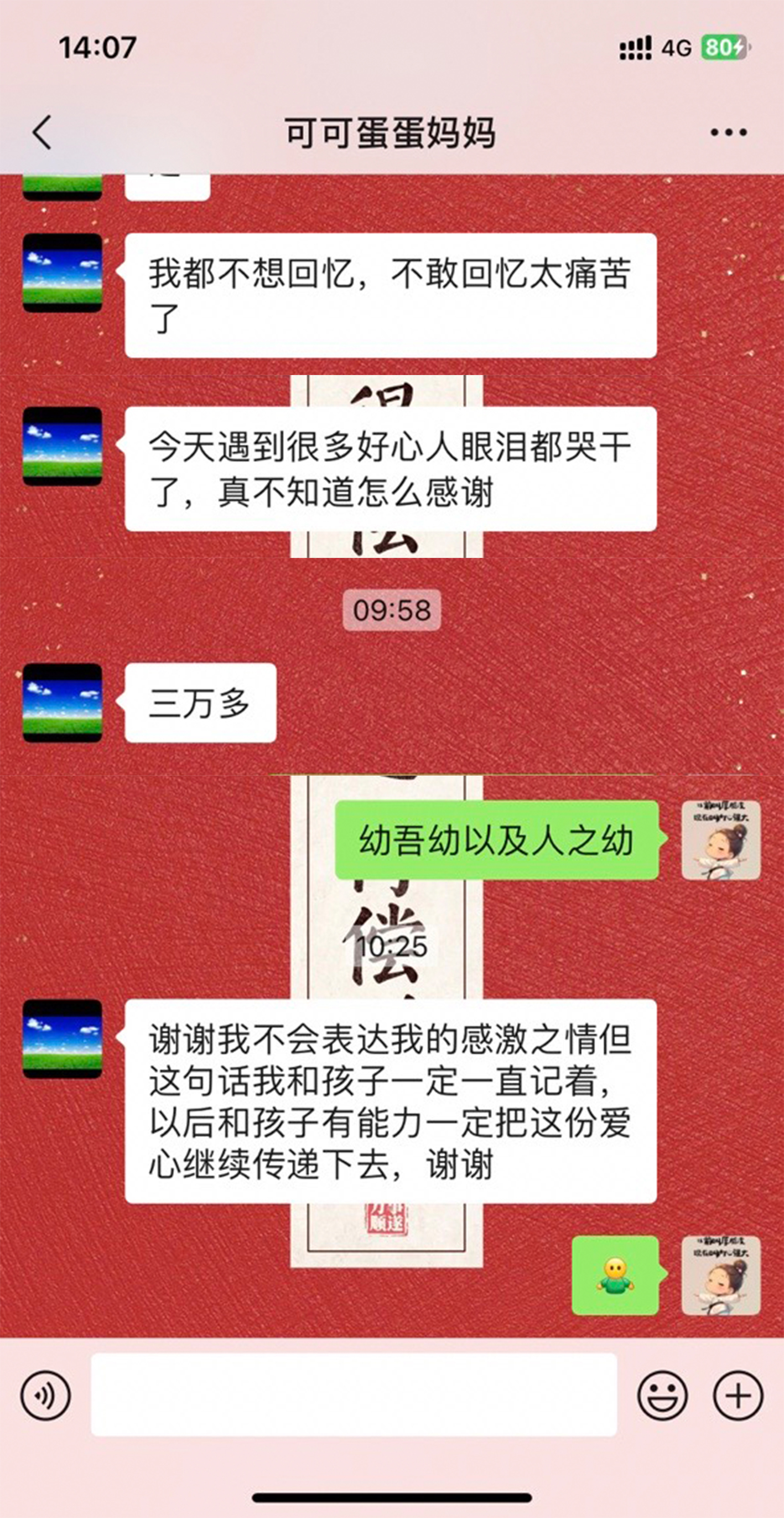“今天遇到很多好心人眼泪都哭干了,真不知道怎么感谢。”回到家后,可可妈妈给马婷婷发来信息:“我不会表达我的感激之情……以后和孩子有能力一定把这份爱心继续传递下去,谢谢。”