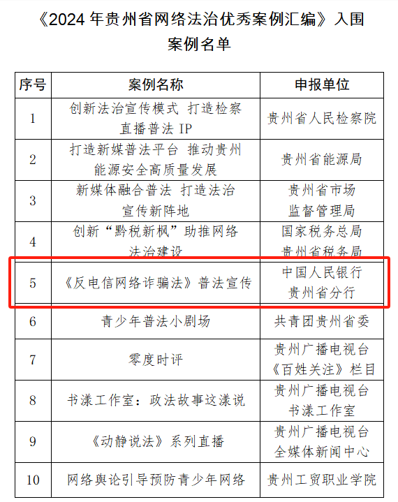 由贵州省委网信办主办的2024年贵州省网络法治优秀案例征集活动结果日前揭晓,中国人民银行贵州省分行的《反电信网络诈骗法》普法宣传案例成功入选。